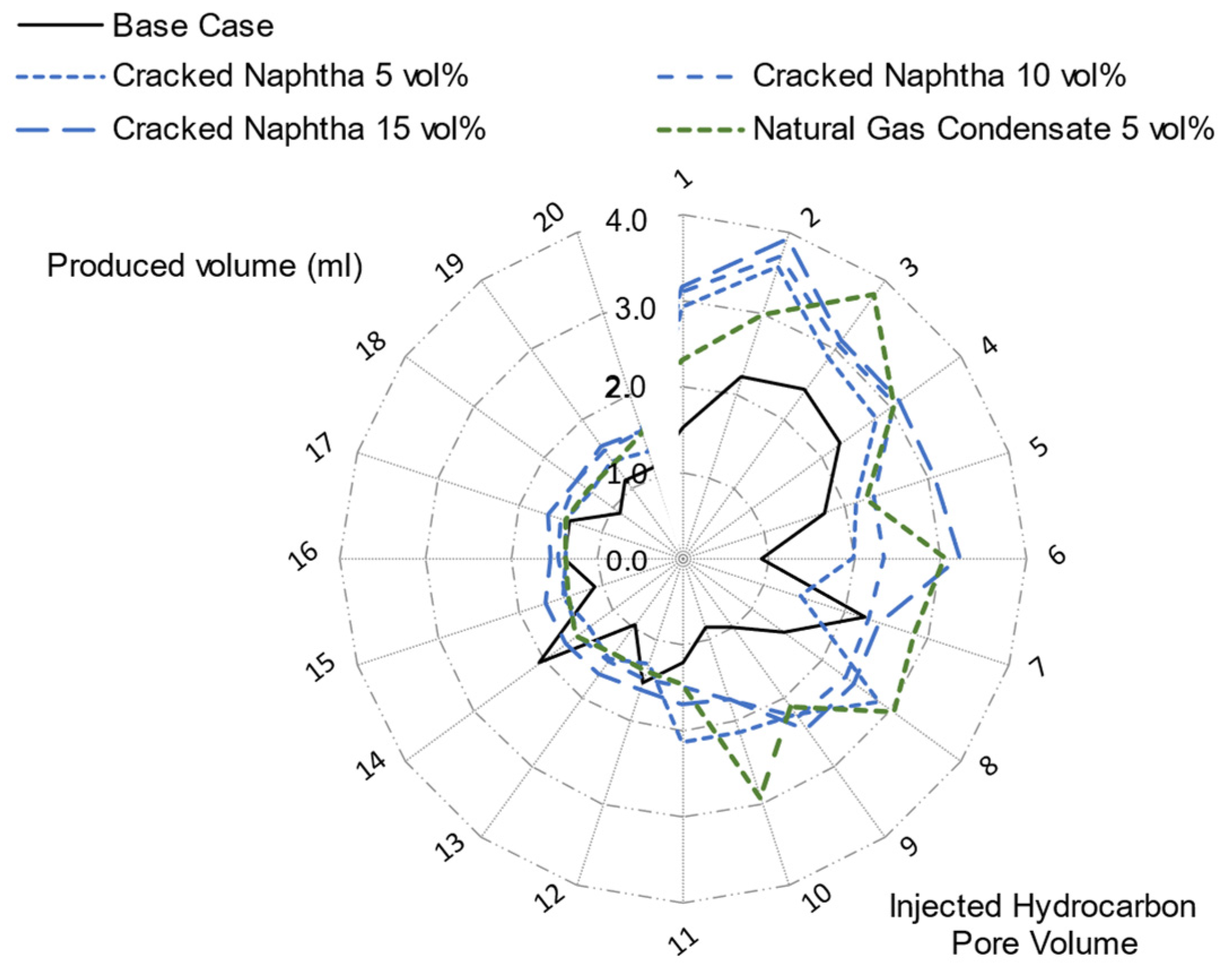 Figure 11). At this point, no significant differences were observed between the various concentrations of cracked naphtha; however, natural gas condensate yielded lower production rates initially. This trend shifted around three injected hydrocarbon pore volumes (IHPV), at which point natural gas condensate surpassed cracked naphtha, sustaining a notably higher oil drainage rate through the mid-phase of the tests.
