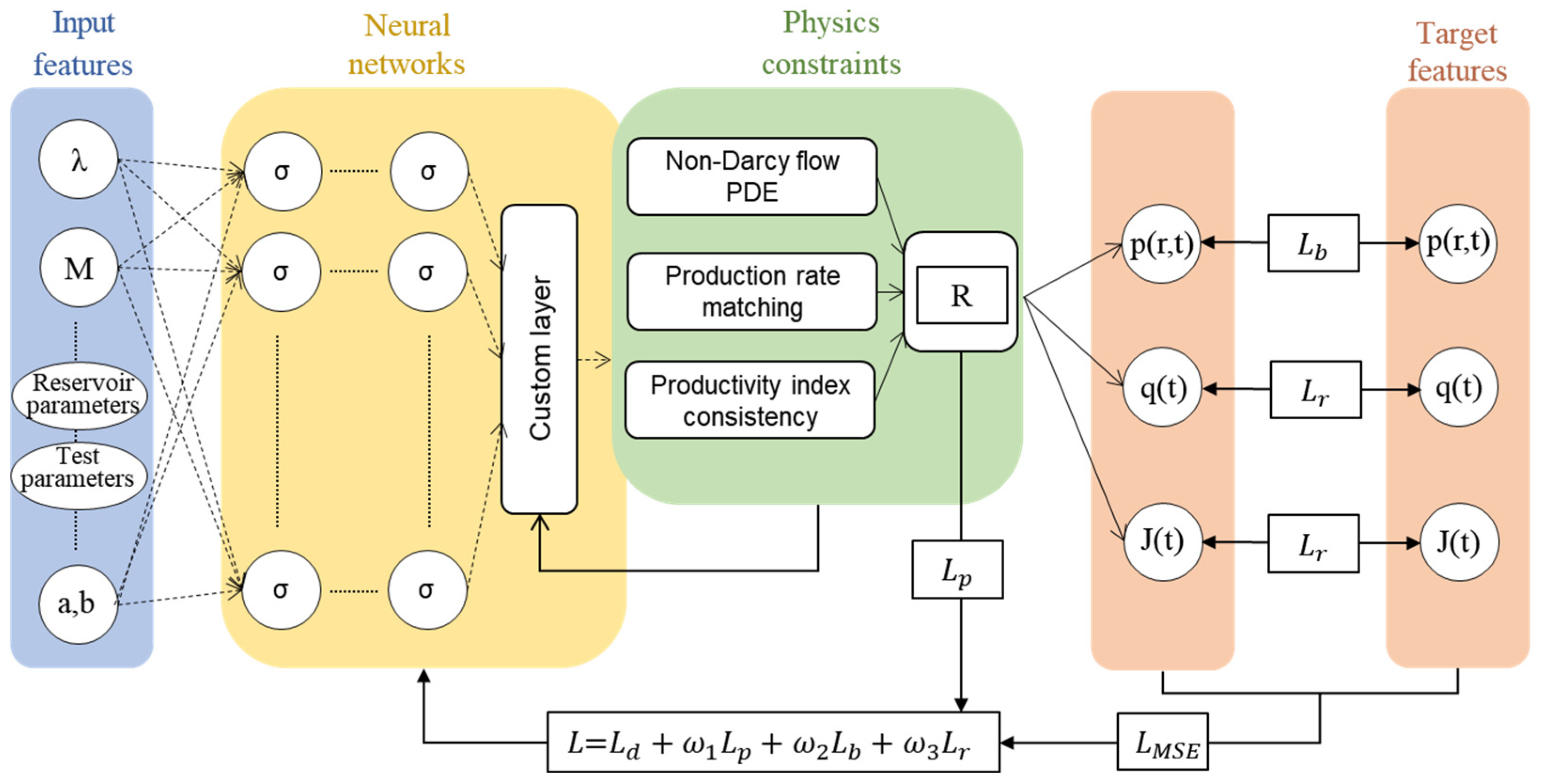 - The data-enhanced model incorporating physics-informed neural networks was proposed to overcome the limitations of purely physics-based or purely data-driven approaches. By embedding prior physical models into the learning process, the framework achieved improved accuracy, robustness, and generalizability in production prediction.