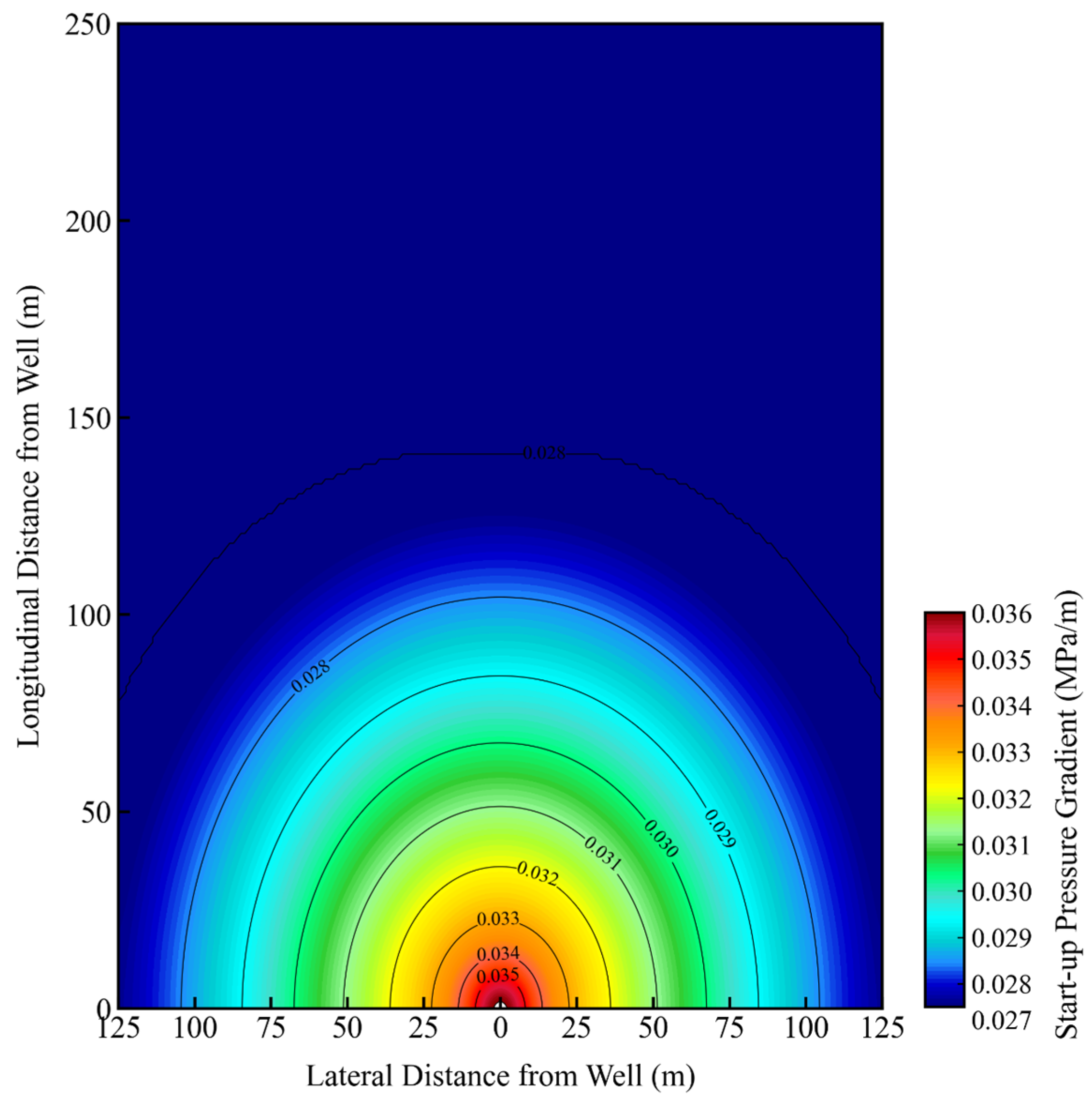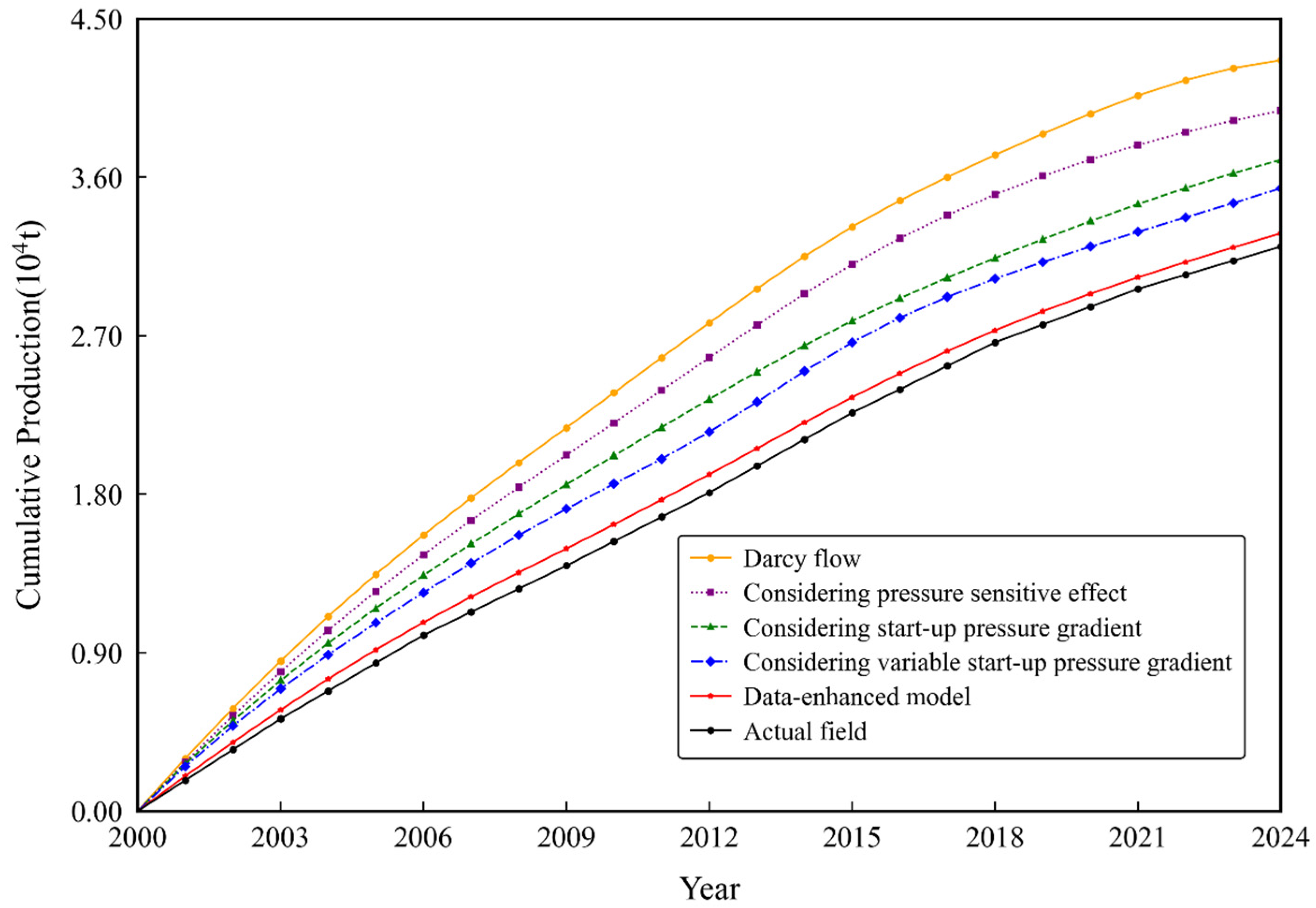 - From physics-based modeling, the study clarified the combined effects of non-Darcy flow, start-up pressure gradient, and pressure-sensitive permeability in ultra-low-permeability systems. By deriving the variable start-up pressure gradient, the research established a mechanistic representation of coupled flow behaviors. This formulation enabled the construction of mathematical and production models that preserve the fundamental physical mechanisms of unconventional reservoirs.