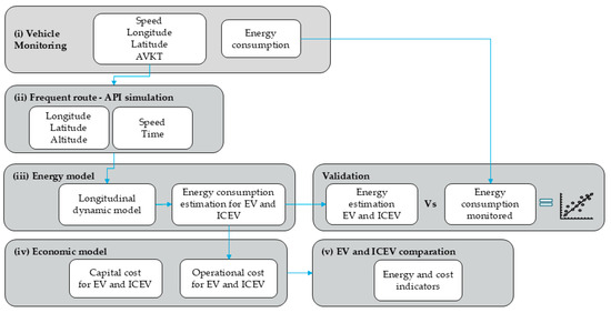 In this regard, the present study proposes a methodology for estimating energy consumption and costs of EVs, applicable to a variety of working conditions and transport services. The methodology incorporates the following contributions: (i) the use of web-based applications and longitudinal vehicle dynamics to calculate energy consumption based on user-defined routes; (ii) the longitudinal vehicle dynamics model includes a dynamic regeneration factor—defined as a function of speed—to estimate energy recovery in braking states. Finally, with the total energy consumption calculated, (iii) comparative cost–benefit analysis relative to combustion engine vehicles is conducted, incorporating energy consumed, average monthly travel, tax, subsidy, and vehicle discount data to verify the economic viability of the use and implementation of EVs.