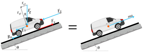 In this study, a model based on longitudinal vehicle dynamics was used to estimate fuel consumption. The model implements the fundamental laws of physics to calculate the longitudinal external forces represented graphically in Figure 2.