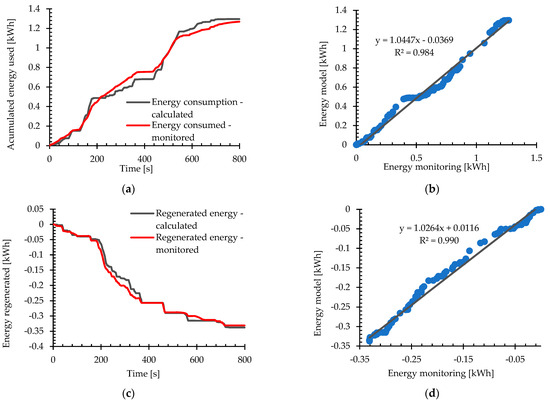 Model validation is carried out using speed, time, and altitude parameters obtained from vehicle monitoring as input variables. The model’s output is then compared against the consumption-related measurements recorded during the monitoring process. The model is subsequently refined to minimize the average error between estimated and observed energy consumption. A 5% error margin is established as the threshold for considering the model highly reliable.