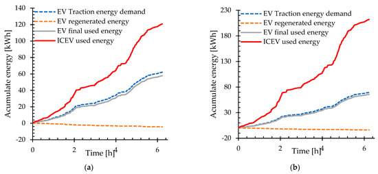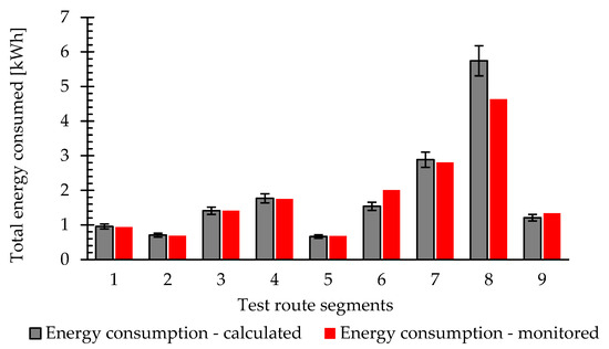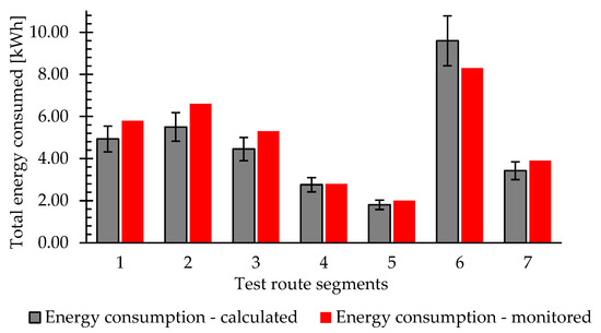 For the study, the energy consumed is determined in small segments with constant time intervals, where is equal to 1 s, so it must be converted to hours using the factor of 3600. The total energy consumed during a trip can be estimated as shown in Equation (9).