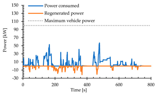 A direct correlation exists between traction power and the energy recovered through regenerative braking. When traction power is positive, it means that the vehicle’s tires receive energy from the propulsion system to generate vehicle motion, thus making the braking energy null. On the other hand, traction power is negative in braking stages, and a fraction of the energy is recovered to the battery [20]. Regenerative power is calculated through Equation (10).