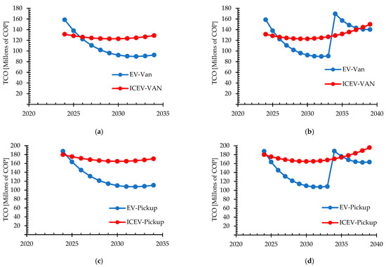 TCO comparation for each type of vehicle both with and without considering battery replacement; (a) TCO comparation for van scenario 1, (b) TCO comparation for van scenario 2, (c) TCO comparation for pickup scenario 1, (d) TCO comparation for pickup scenario 2.