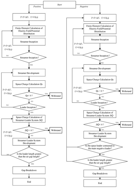The physical process of positive and negative lightning impulse discharge characteristics in long air gaps was established, and the calculation flow chart is shown in Figure 2.