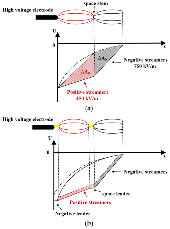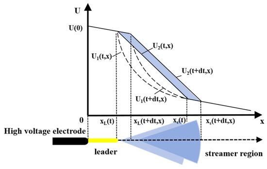 Gallimberti, Bondiou, and colleagues proposed a streamer development model that utilizes the spatial distribution of the background potential and the potential gradient in the streamer region to calculate the streamer region length [22]. The development of the positive streamer region and the calculation of streamer length are shown in Figure 3.