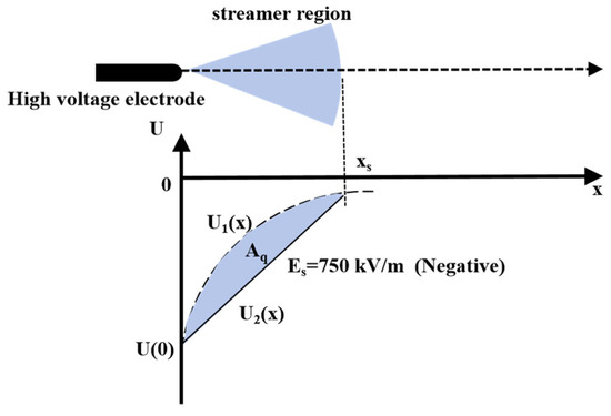 In this paper, the method proposed in Reference [23] establishes the relationship between the change in background potential before and after the streamer starts and the charge in the streamer region, which can also be applied in the case of negative corona. The schematic diagram of the negative streamer region is shown in Figure 6.