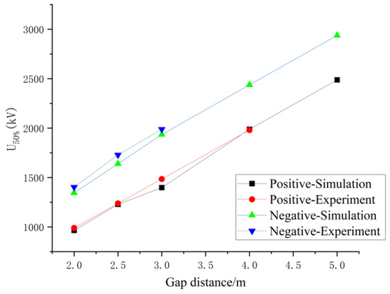 Based on the physical models of positive and negative polarity discharges, 20 consecutive simulation runs were performed using the up-and-down method for different gap distances under positive and negative lightning impulse voltages. The average value of the calculated results was taken as the 50% breakdown voltage.