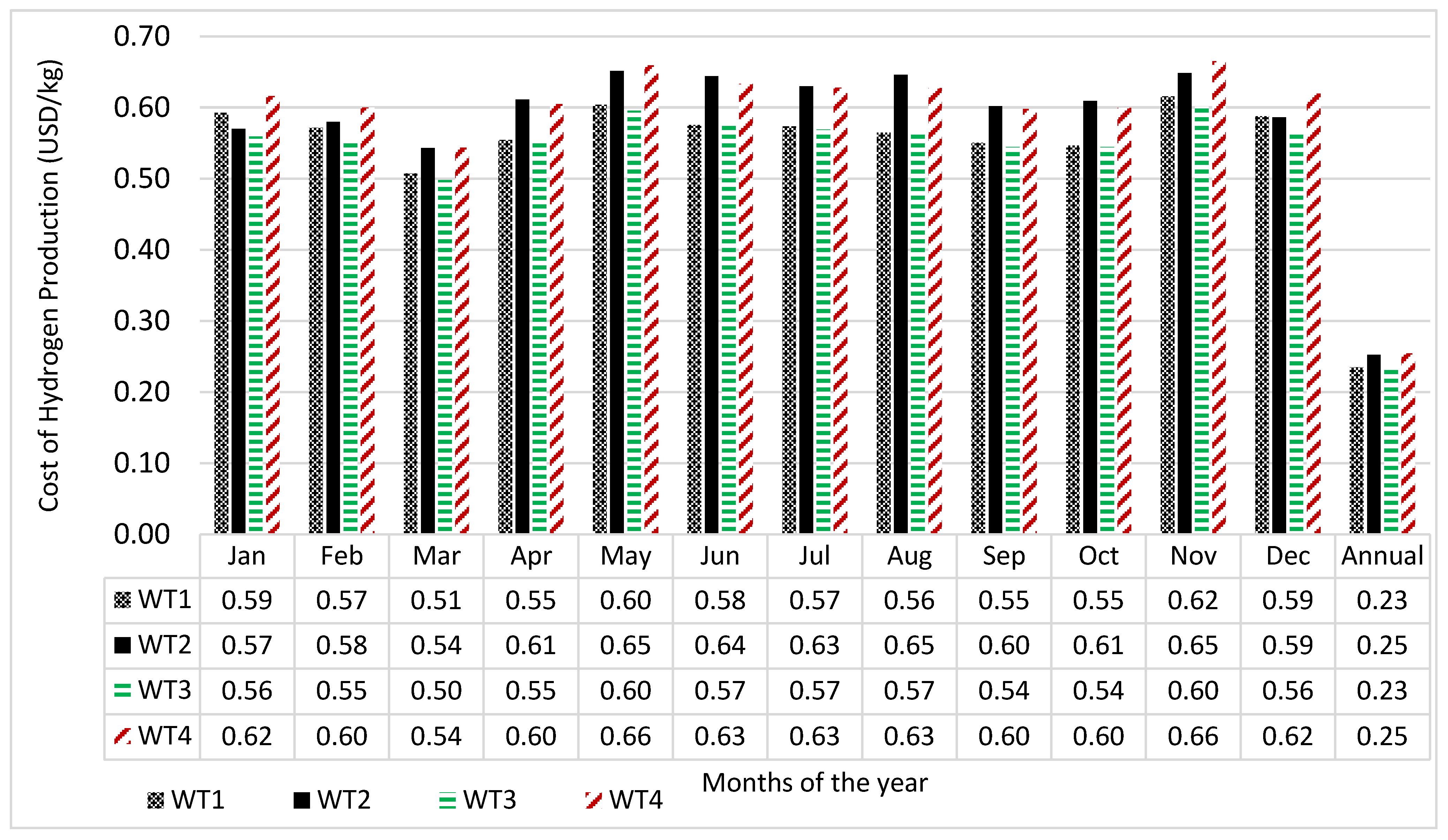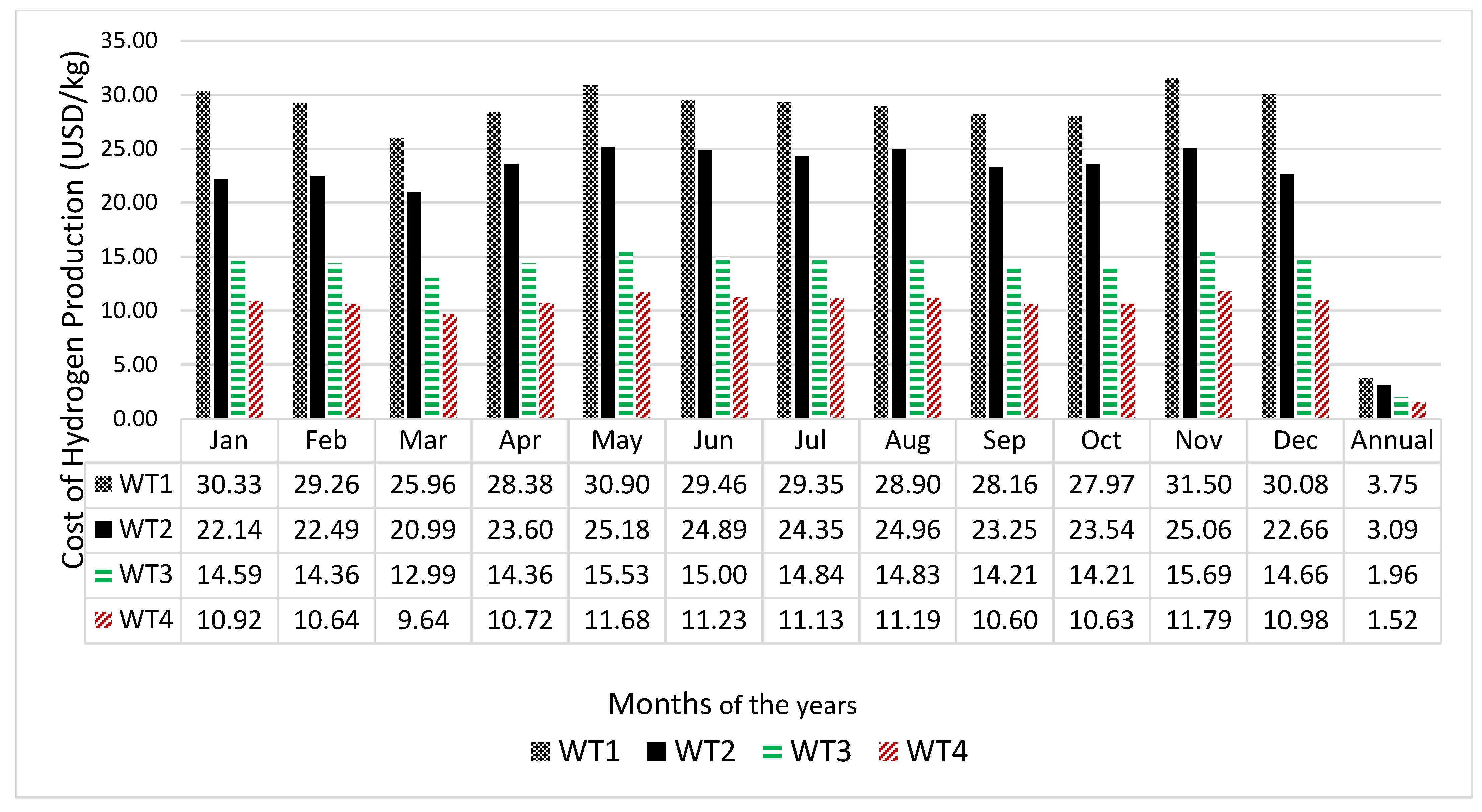 Some researchers have also conducted research on the economic viability of hydrogen production from wind energy generators: Ayodele and Munda [20] explored the financial practicality of producing hydrogen from wind-generated electricity from 15 locations in the coastal region of South Africa using 11 different wind turbines. It was concluded that site Napier presented the best yield of hydrogen production with 226.82 metric tons of hydrogen at 1.4 USD/kg using wind turbine (Gamesa G128) having a rated power of 4.5 MW, cut in, rated and cut-out wind speeds of 4 m/s, 13 m/s and 18 m/s, respectively. Techno-economic analysis of hydrogen refuelling stations powered by hybrid of wind and photovoltaics (PV) system was performed for Izmir-Cesme, Turkey using HOMER simulation software [21]. The authors revealed that the levelised cost of hydrogen generation was between USD7.526–7.866/kg indicating that renewable energy-based hydrogen refuelling stations could be implemented in İzmir–Çeşme, Turkey with economic feasibility. Igbal et al. [22] investigated the economic feasibility using wind energy potential of eight sites in Sindh province of Pakistan. The study demonstrated that producing renewable hydrogen using wind resources is financially sustainable at the levelized cost of 4.02–4.310 USD/kg-H2 depending on the amount of wind energy accessible for electricity production. It was also demonstrated that the total electricity that could be generated from wind power in Pakistan is 119,410 MW; this could generate approximately 5200 kg of hydrogen per day.