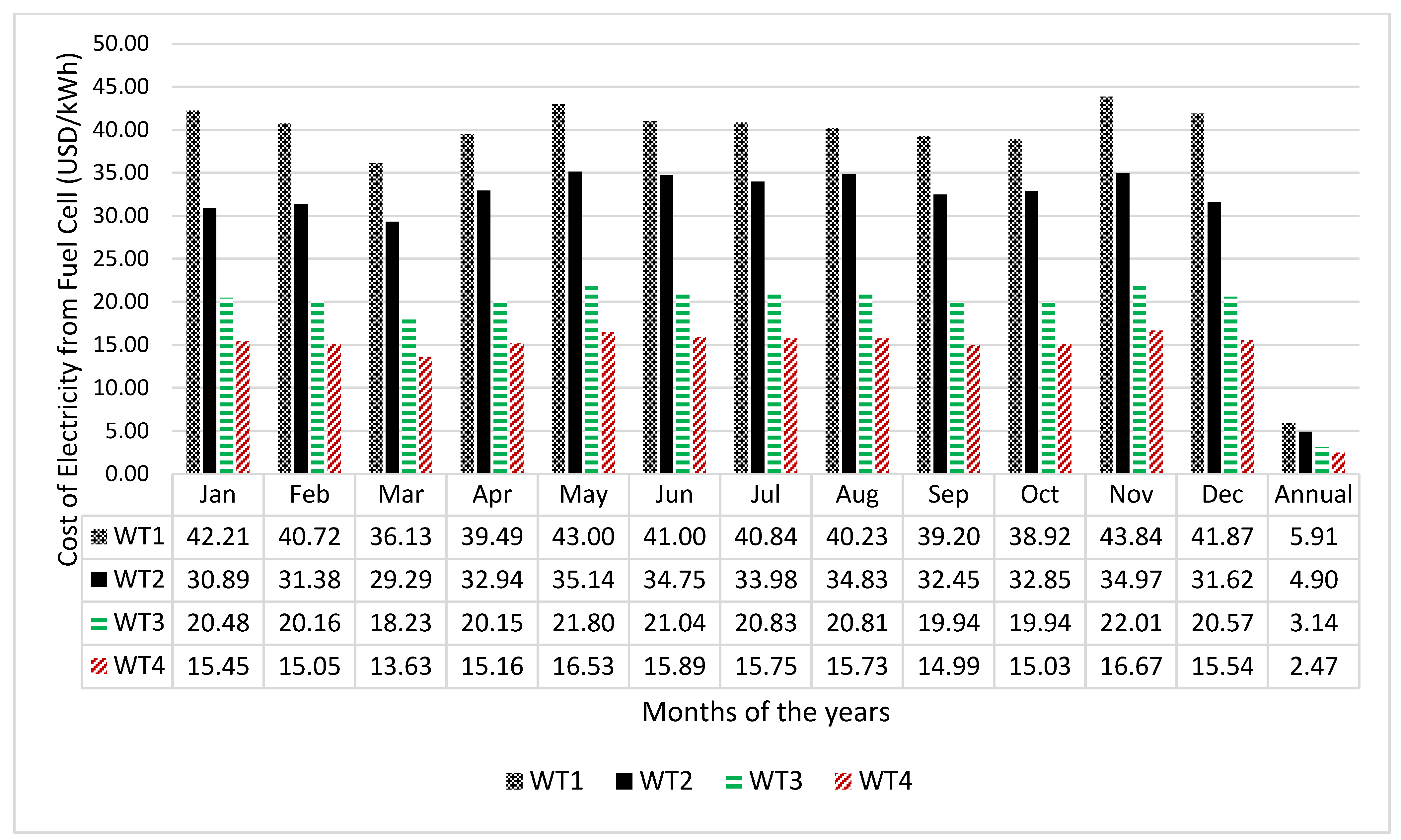 This section presents the estimation of the unit cost of energy from the wind turbine, the unit cost of hydrogen production using a PEM electrolyser, and the cost of electricity generation from a fuel cell generator. First, the capital costs of the wind turbine ( C c a p ( W T ) ), electrolyser ( C c a p ( E l ) ), hydrogen tank (HT) and the fuel cell ( C c a p ( F C ) ) in USD were calculated from their specific costs, respectively as follows: