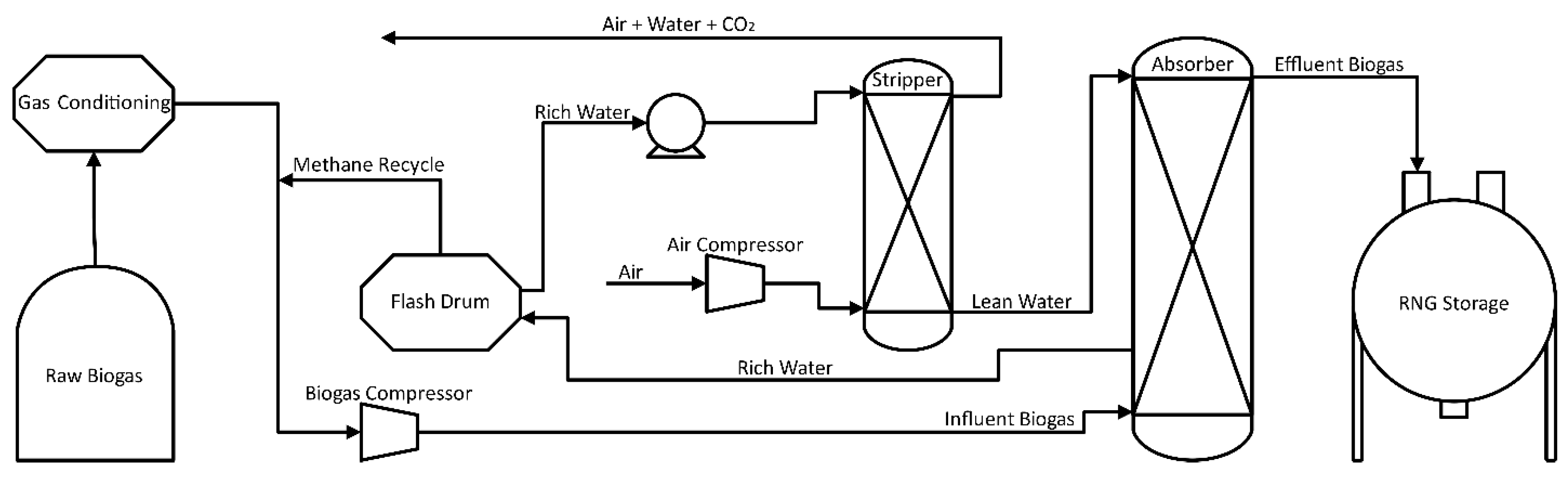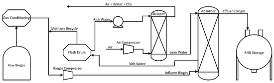 - Rotunno, P.; Lanzini, A.; Leone, P. Energy and economic analysis of a water scrubbing based biogas upgrading process for biomethane injection into the gas grid or use as transportation fuel. Renew. Energy 2017, 102, 417–432. [Google Scholar] [CrossRef]