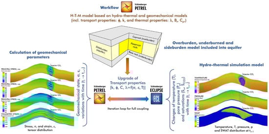The dynamic simulation environment presented in this study assumed variable characteristics based on the actual operating cycle of the offshore oil reservoir, including an increasing number of production and injection wells and variable production and injection rates. Injection fluid temperature and downhole production pump pressure were treated as constant factors. A reservoir formation consisting of a rock matrix with natural fractures is continuously subjected to elastic deformations until the fractures are reactivated or the rock fails. The numerical method is characterized by the reciprocal linking of hydrothermal flow simulations and geomechanical state calculations, which lead to modifications of the rock transport properties [48]. The numerical procedure begins with an Eclipse simulation to generate initial distributions of reservoir properties (pressure, temperature, and fluid saturation). Then, for this point in time, the geomechanical state is calculated to obtain initial stresses and strains as a reference for further changes. In the next step, the Eclipse simulator proceeds to calculate reservoir property distributions for subsequent time steps, up to the first coupled time step (at the end of the first year). The coupling process involves calculating stress and strain changes based on pressure and temperature changes relative to the initial state. Changes in the geomechanical state generate updates to distributions of transport properties (porosity and permeability), which are implemented in the next time step of the Eclipse simulation (at the beginning of the second year). After n-time steps between couplings, the Eclipse simulation proceeds to the second coupled time step (at the end of the second year). It is possible to manually define a larger number of coupled time steps to increase the continuity of the geomechanical state assessment. It was found that a yearly coupled time is sufficient to obtain reasonable results, due to the assumed interdependence between the geomechanical state and continuous pressure and temperature changes. In order to obtain a consistent solution, numerical simulations of the fluid and heat flows are performed, complemented by calculations of the stress and strain tensor at each reported time step. In the case of the hydrothermal model, the modifications of the basic output properties, including pore pressure (), temperature (), and fluid saturation (), are calculated continuously over a selected time interval (). The acceptable disadvantage of this method is the assumption that the changes in the transport properties () are delayed until the next time step (), since the change in the elastic stiffness tensor () must be calculated in advance. The numerical procedure is performed under the control of the Petrel workflow environment. The procedure involves alternating calls of the flow simulations with Eclipse and the geomechanical state computations. A schematic representation of the effective HTM coupling procedure applied to the integrated model for the selected time interval () is shown in Figure 1.