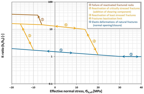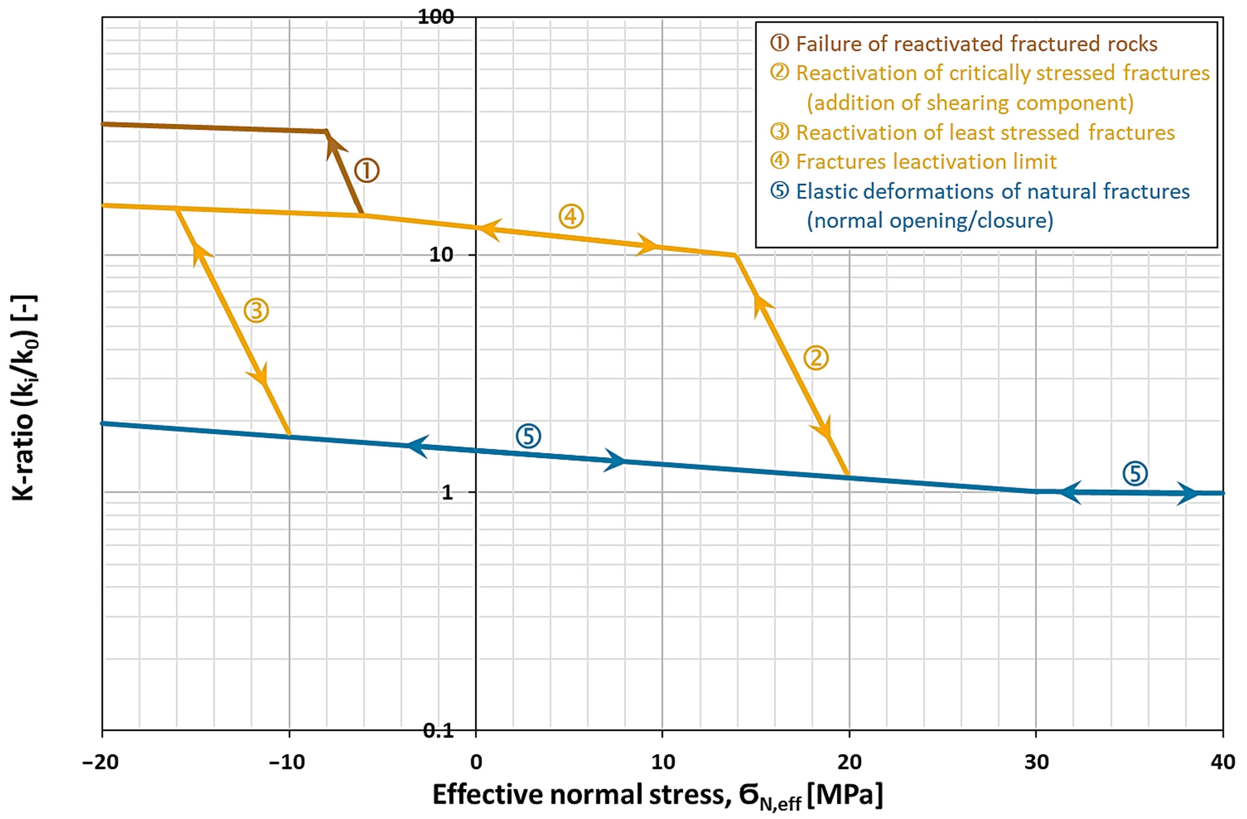 Schematic relationships between the ratio of the increase in permeability () and the effective normal stress (). The brown line (1) determines a failure of fracture-prone rock masses with the formation of new fractures. The yellow curve (2) indicates the permeability route of critically stressed fractures during the reactivation process. The yellow curve (3) indicates the reactivation of fractures that are not optimally aligned. The yellow curve (4) marks the boundary of the reactivation mechanism of the fractures. The blue line (5) refers to the development of fracture permeability under elastic deformations.