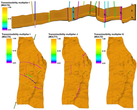 The structural model selected for this study assumes that the fault zone is divided into the barely permeable fault core and the conductive damage zone due to the occurrence of natural fractures [69]. The fault core is formed by the crushing of rock into a clay fraction and represents an effective barrier perpendicular to the direction of flow. The damage zone surrounding the fault core is a volume of rock traversed by a dense network of natural fractures that have developed close to the slip surface of the fault on both sides [70]. Therefore, the damage zone is characterized by increased permeability along the fault plane. The permeability of the damage zone in a direction perpendicular to the fault surface is usually lower, as most fractures are aligned with the main fault plane. The effectiveness of the fault zone system as a barrier was tested during the history-matching process. The results of history matching and division of the zones in the geological model are shown in Figure 4.