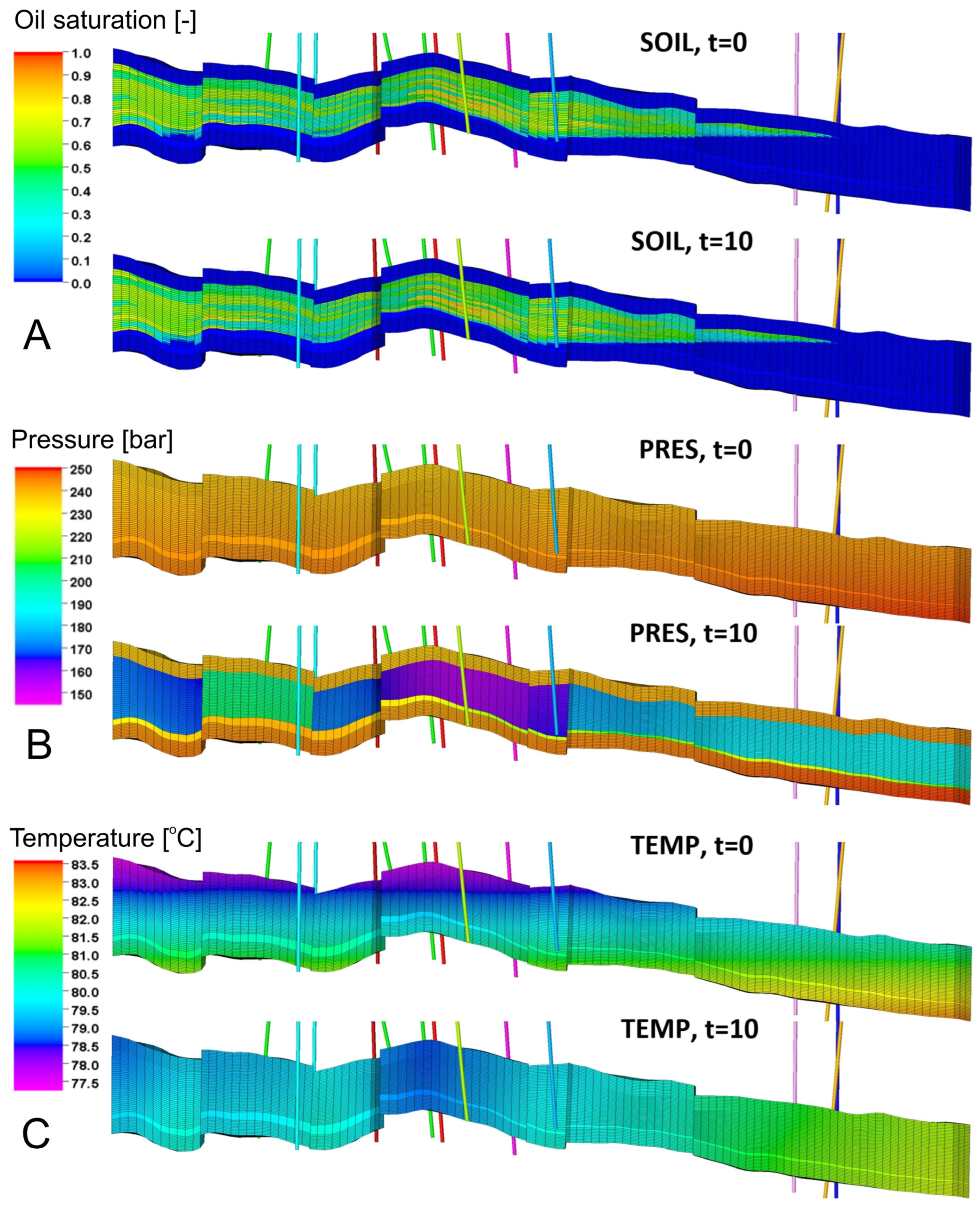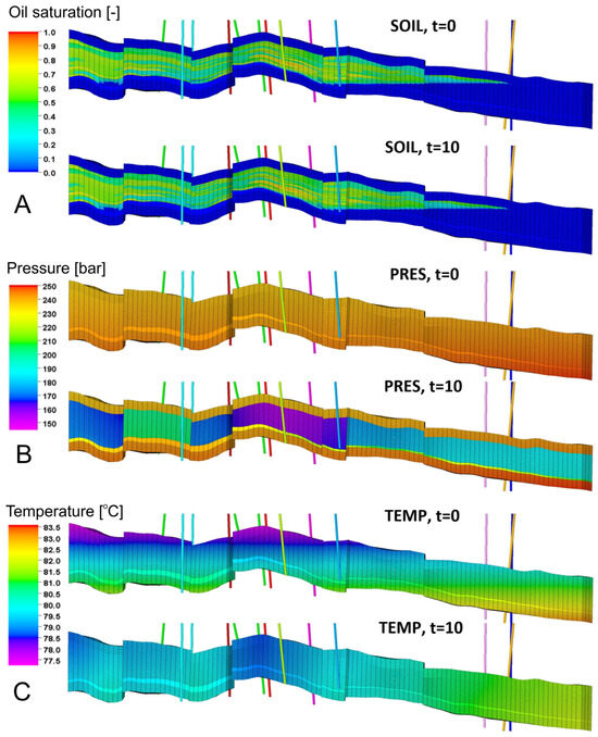 The distributions of oil saturation (SOIL), pressure (PRES), and temperature (TEMP) for the initial state (t = 0) and the pre-injection phase (t = 10) on an exemplary vertical cross-section SW–NE. Exemplary cross-sections of oil saturation (A) pressure (B) and temperature (C).