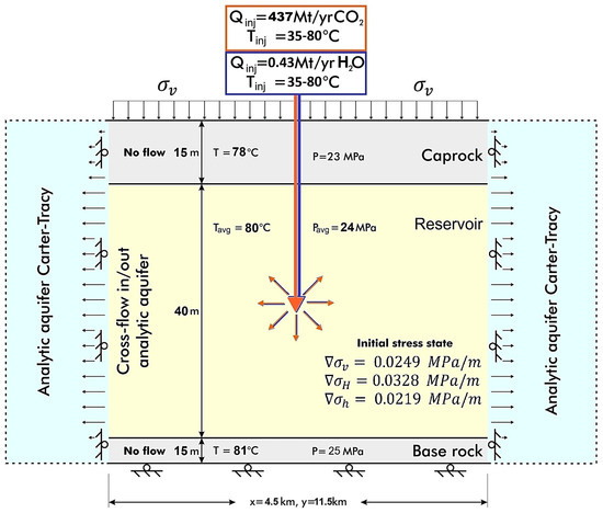 The scheme with the initial properties, the boundary conditions, and the geometry of the geomechanical model. Orange and blue arrows indicate the directions of spread of the injected fluid.
