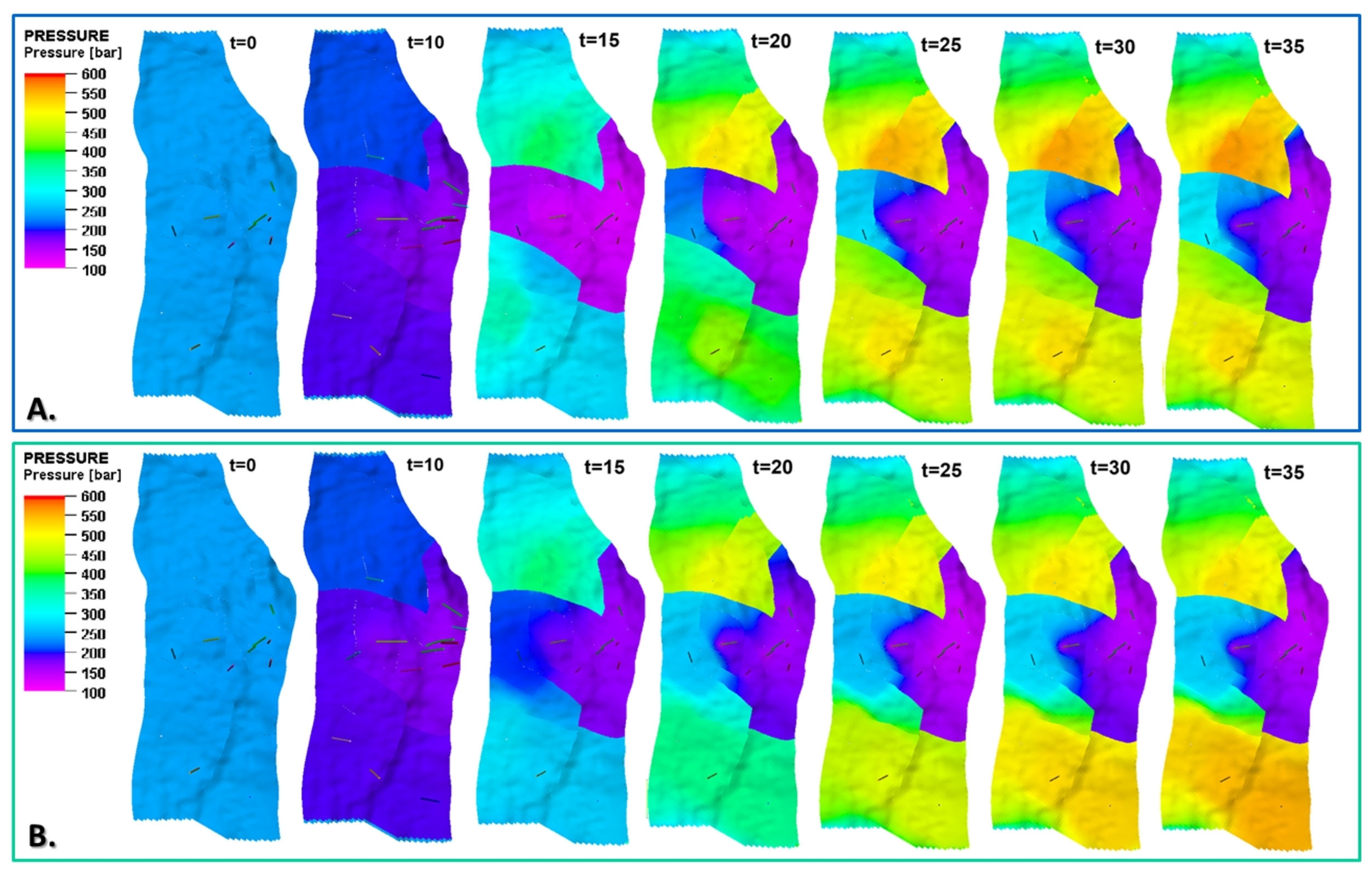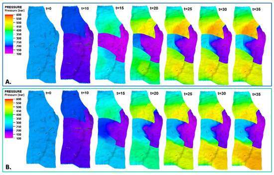 Examples of pressure distributions for the initial state and 10, 15, 20, 25, 30, and 35 years of exploitation of the oil reservoir using IOR/EOR methods, including water flooding (A) and water–CO2 injection (B). Middle layer of reservoir model (K = 30).