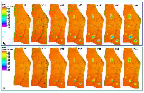 Examples of temperature distributions for the initial state and 10, 15, 20, 25, 30, and 35 years of exploitation of the oil reservoir using IOR/EOR methods, including water flooding (A) and water–CO2 injection (B). Middle layer of reservoir model (K = 30).