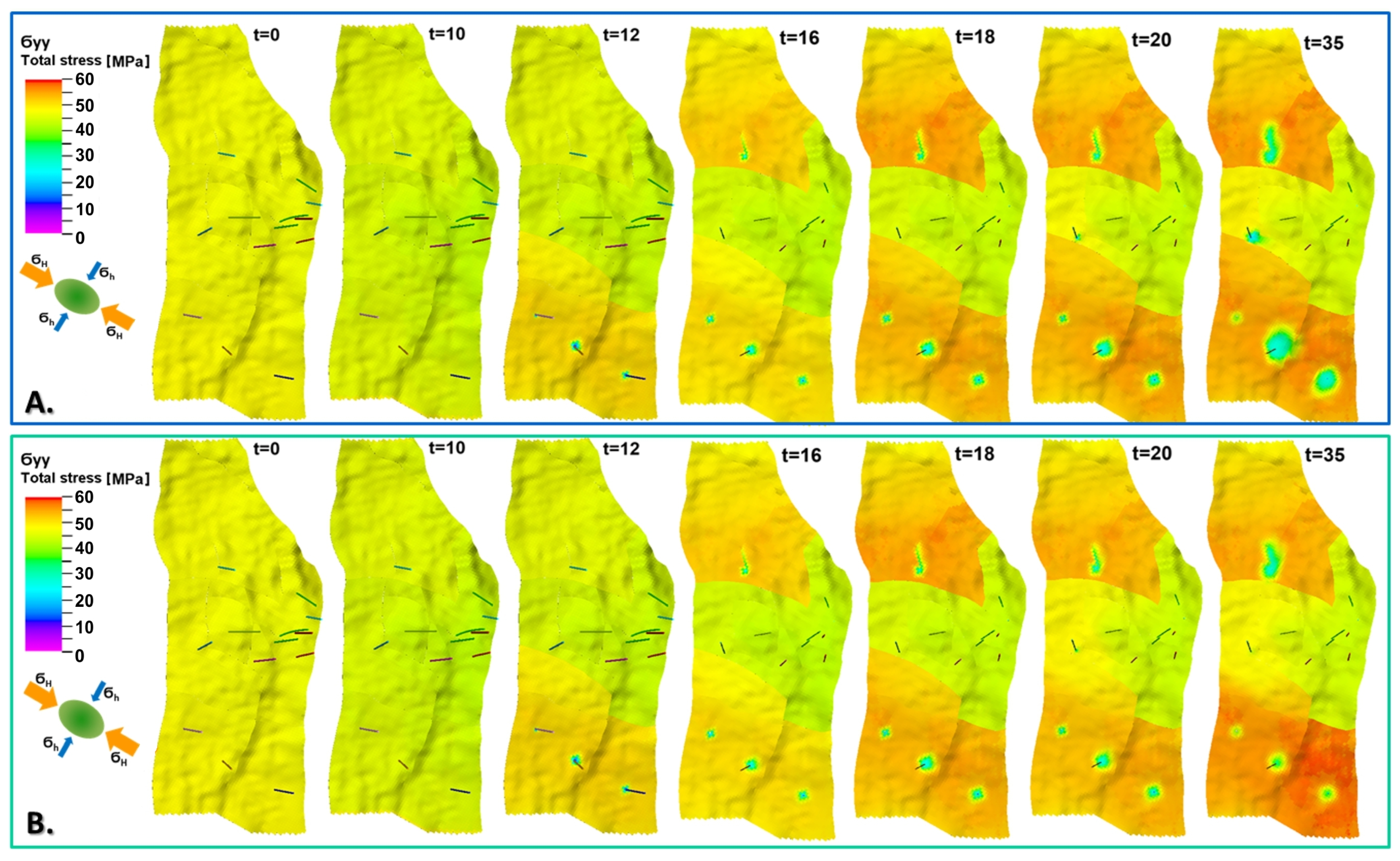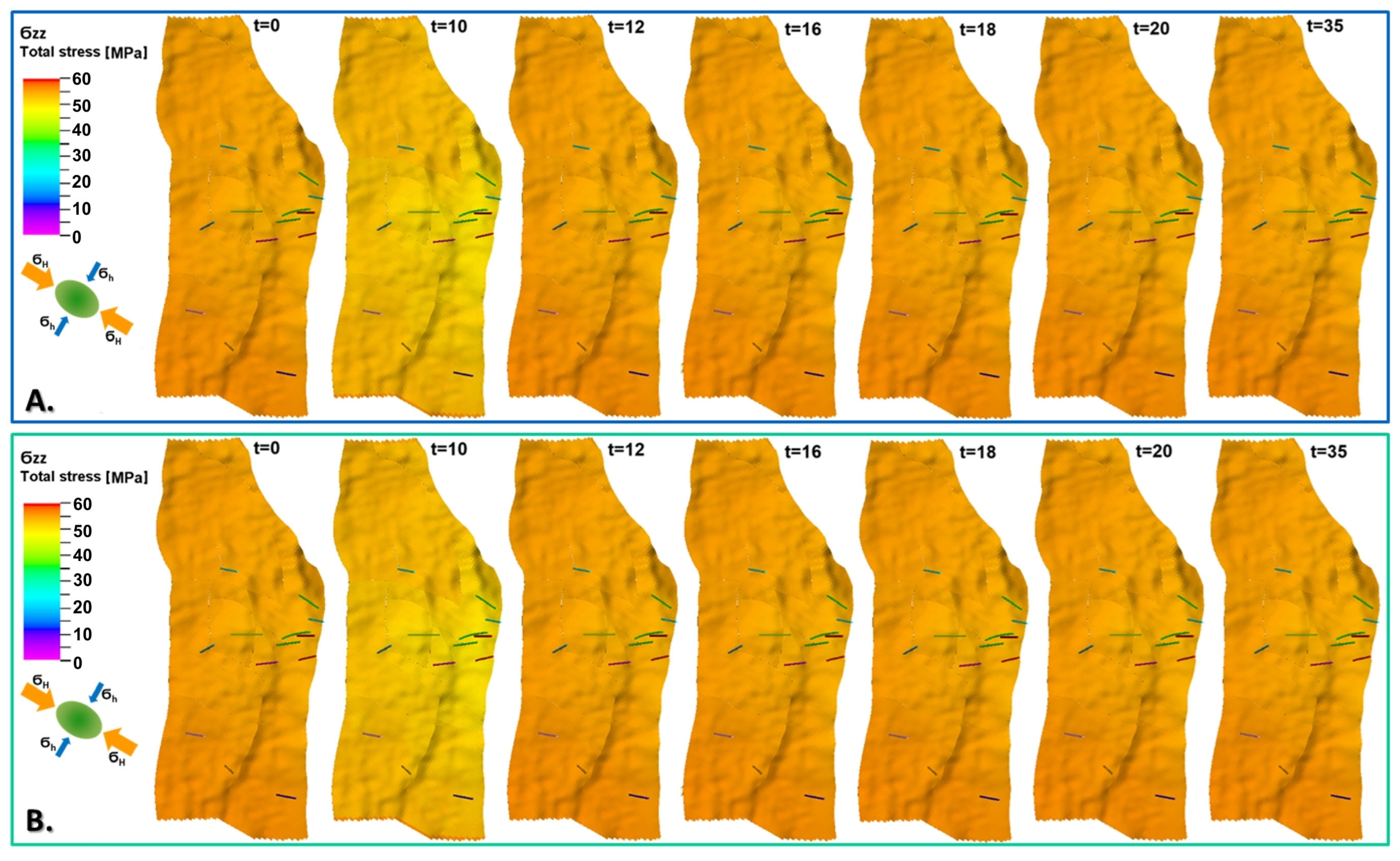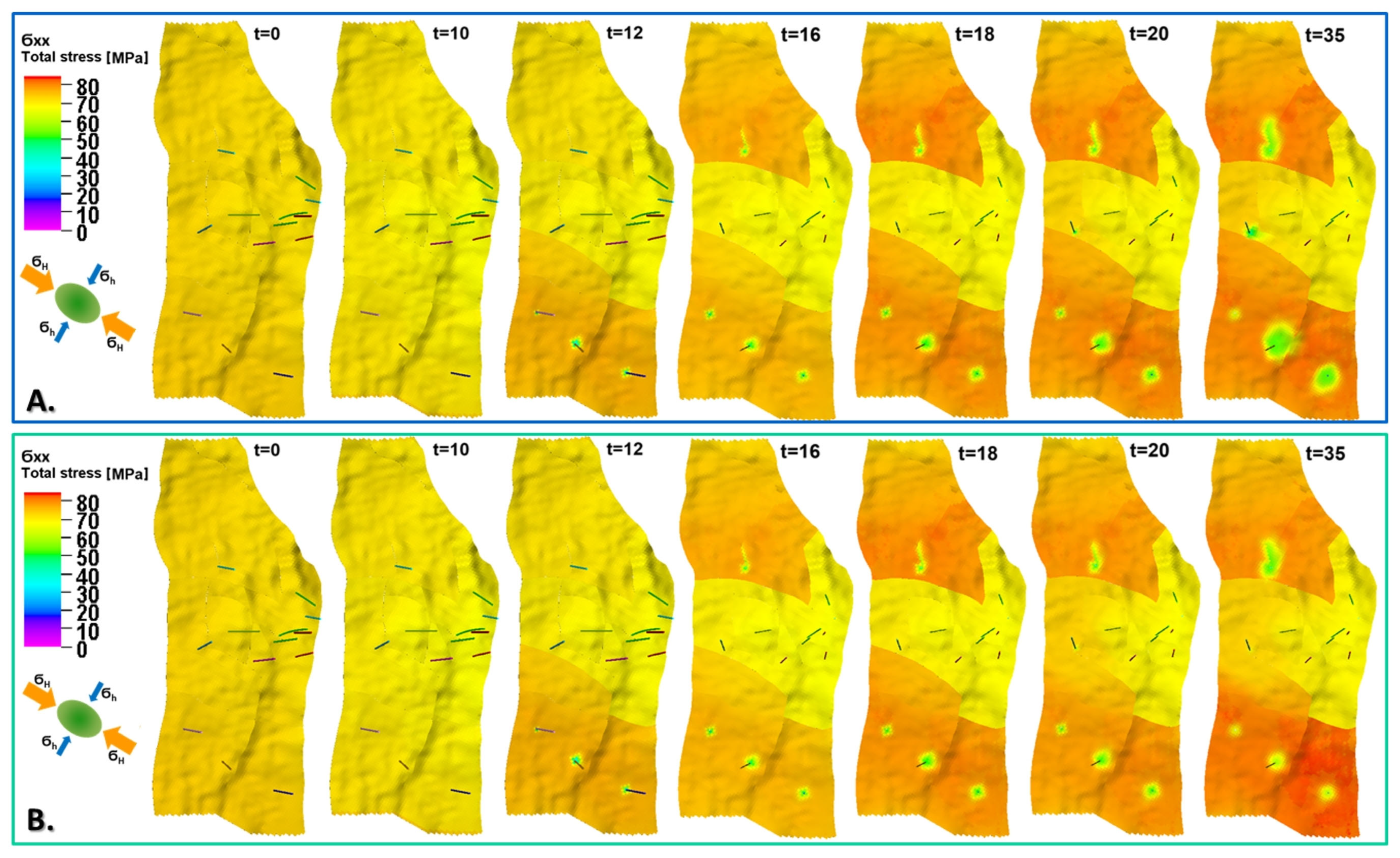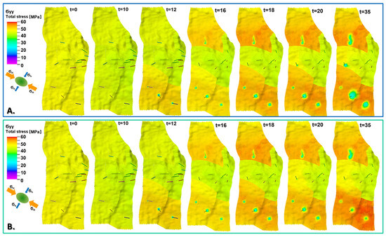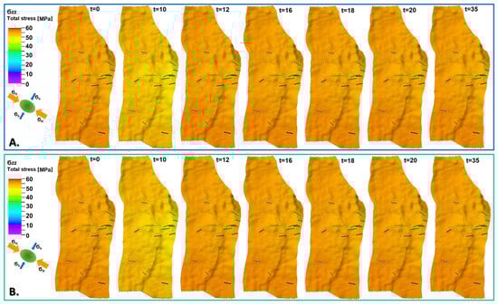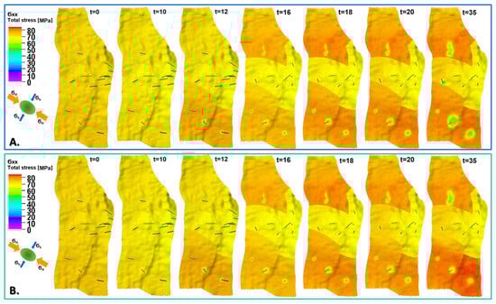 Exemplary distributions of horizontal stress component () for initial state and 1, 10, 15, 20, 25, 30, and 35 years of oil production with EOR, including water injection (A) and water–CO2 injection (B). Middle layer of reservoir model (K = 30).