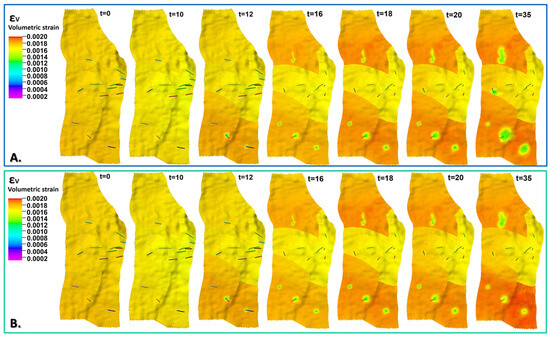 Exemplary distributions of volumetric strain () for initial state and 1, 10, 15, 20, 25, 30, and 35 years of the production with EOR, including water injection (A) and water–CO2 injection (B). Middle layer of reservoir model (K = 30).