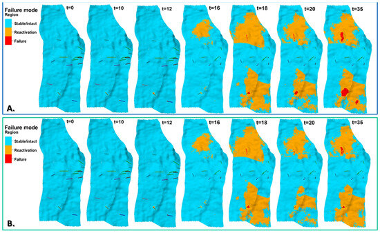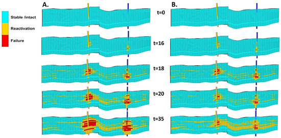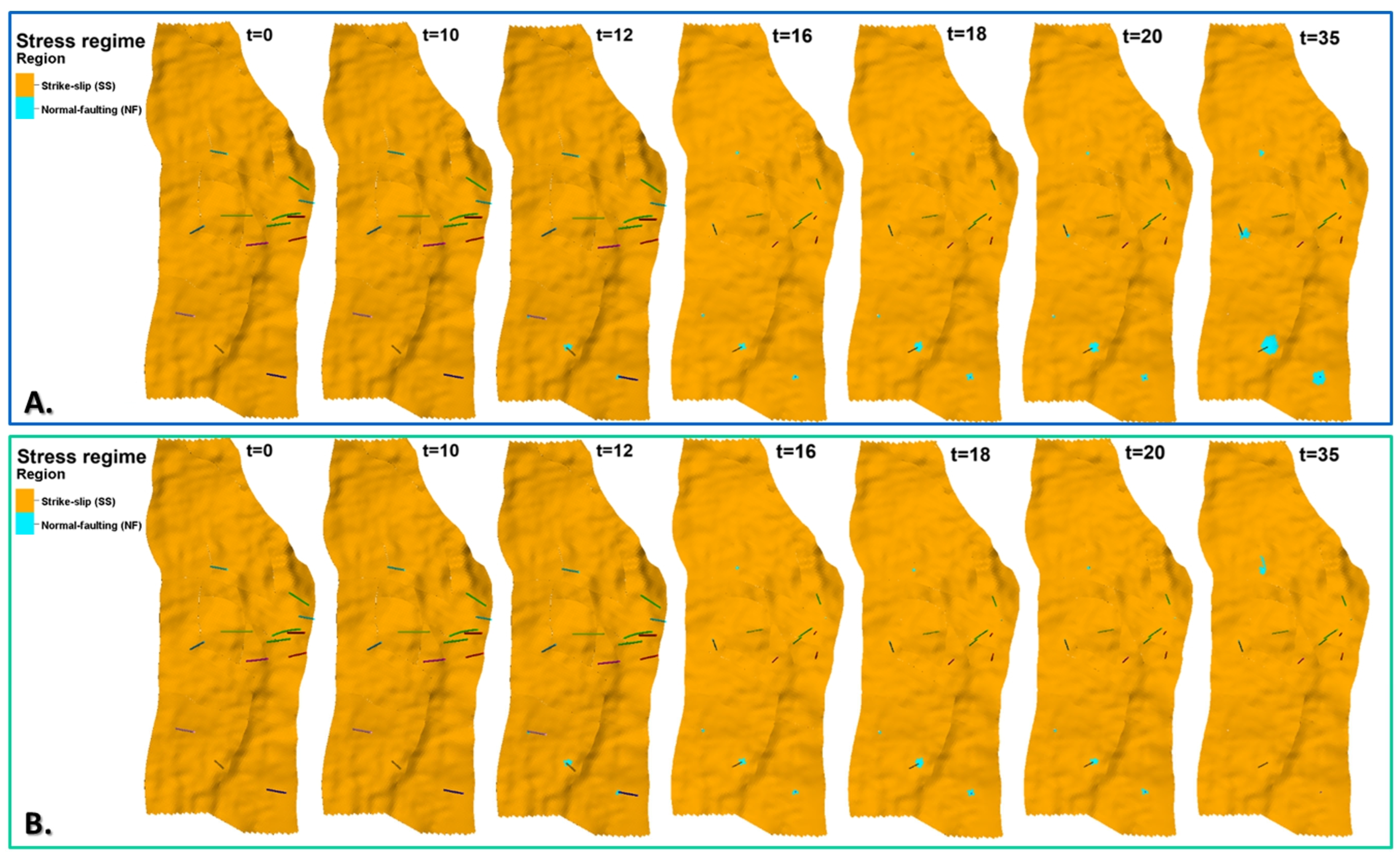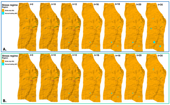 Exemplary distributions of stress regime, orange—strike-slip () or blue—normal faulting (), for initial state and 1, 10, 15, 20, 25, 30, and 35 years of oil production with EOR, including water injection (A) and water–CO2 injection (B). Middle layer of reservoir model (K = 30).