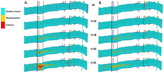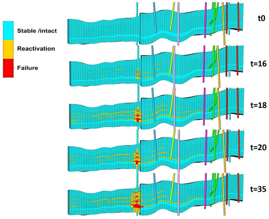Any type of rock failure would have a significant impact on the flow conditions in the structure of the oil reservoir, as already described in Figure 2. Furthermore, damage to the overburden may result in the reservoir no longer being leak-tight, as potential CO2 escape paths through the overburden will be created. The modeled temperature drop near the injection wells leads to a rapid failure of the rock in tensile mode, accompanied by the reopening of existing natural fractures. In the scenarios with waterflooding, the extent of the tensile failure zone increases as the IOR process progresses, as does the extent of the cooled zone. Compared to the EOR-CO2 scenarios, the reservoir formation becomes more stable and the volume occupied by damaged rock decreases, as shown in Figure 15. The process of reactivation of natural fractures follows the directions of the reservoir volume affected by rock failure, but over a much larger area. For example, the area reactivated by the temperature drop thus surrounds the volume of the failed rock around the injection wells. The overpressure-induced reactivation of fractures occurs near the injection wells, mainly north of the southern wells (XI-1, XI-2) and to a lesser extent north of the northern well (XI-4). The failure of the rock in tensile mode increased the permeability of the zones near the injection wells, which led to a decrease in injection pressure due to the decrease in the flow resistance of the formation. The observed geomechanical response of the oil reservoir is consistent with the recorded events in the production history, particularly the accelerated water breakthrough from the south into the XP-4 production well and the increased communication with the aquifers through the reactivated zones.