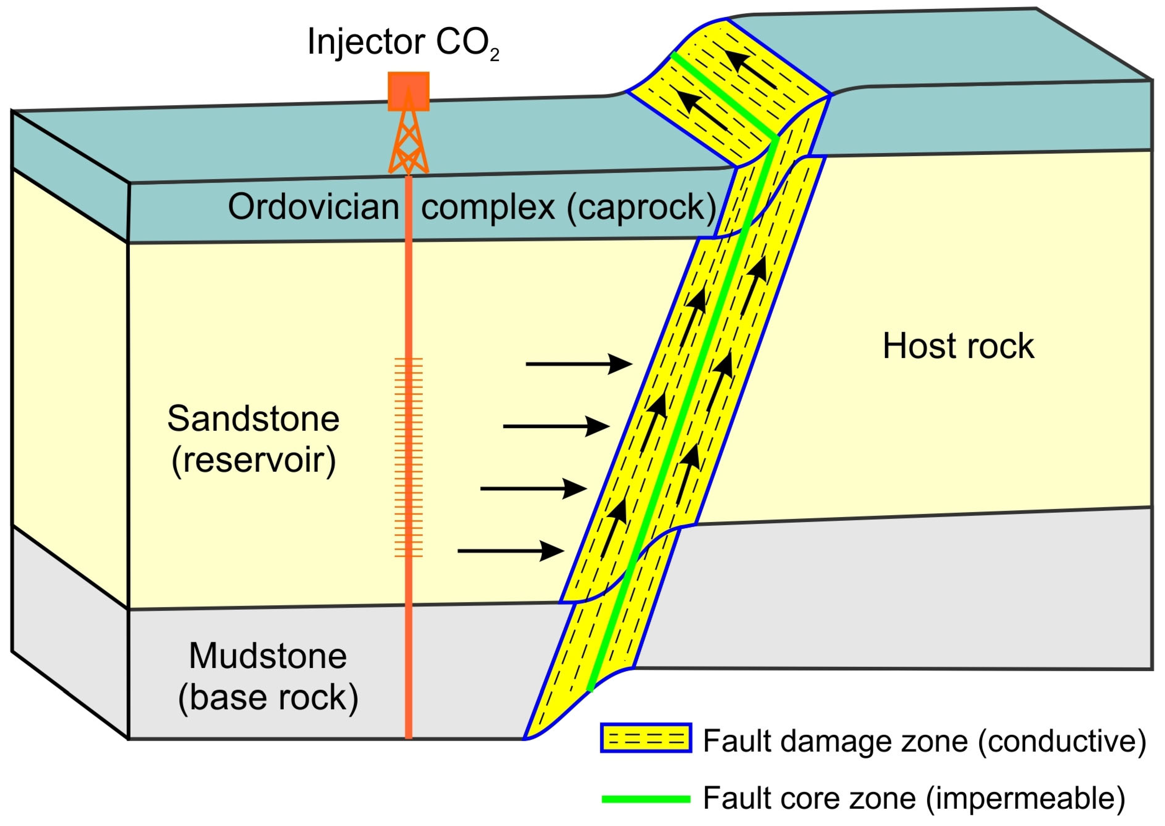 Schematic of the structural model, including model zonation, dislocation, and leakage pathways. The intact host rock is separated by the fault zone, which is composed of two individual facies: an impermeable fault core and a highly conductive, naturally fractured damage zone. The potential CO2 leakage pathways are marked with black arrows.