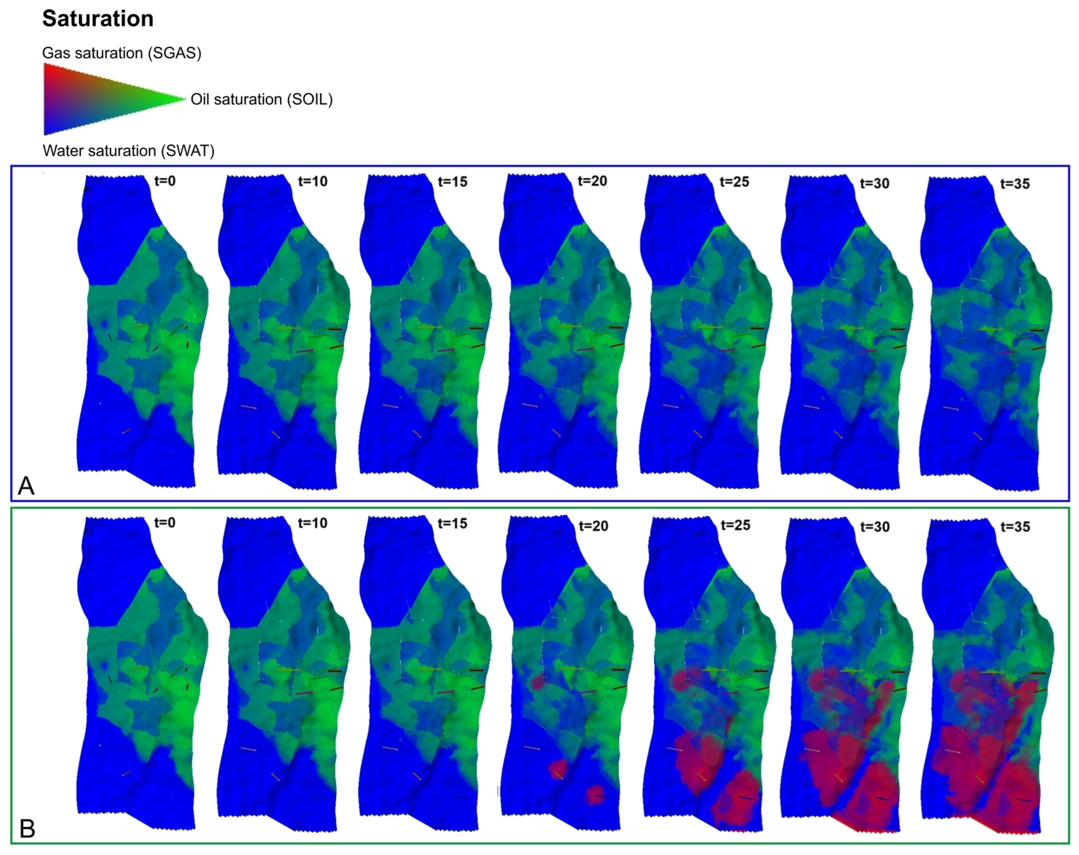 Examples of fluid saturation distributions (water—blue, oil—green, and CO2—red) for the initial state and 10, 15, 20, 25, 30, and 35 years of exploitation of the oil reservoir using IOR/EOR methods, including water flooding (A) and water–CO2 injection (B). Middle layer of reservoir model (K = 30).