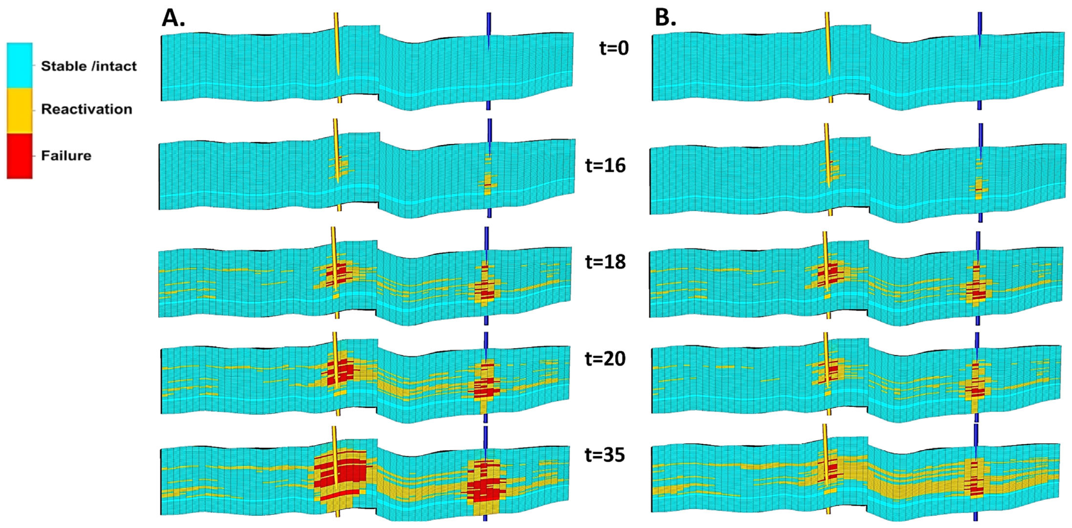 Thermoelastic-induced stress unloading causes a rotation of the original stress tensor, which is accompanied by a rapid transition from the strike-slip stress (SS) regime to the normal fault (NF) regime. The local extent of the occurrence of the NF stress regime can be seen in Figure 14. The observed change in stress state can have a significant impact on the failure mode and the kinetics of the induced dislocation movements. The compressive strike-slip regime favors the reactivation of critically stressed fractures or the development of shear fractures within the reservoir formation and caprock during horizontal displacement. The area affected by a normal faulting stress regime is more prone to the development of tensile fractures or the reopening of existing discontinuities with accompanying vertical rock displacements.