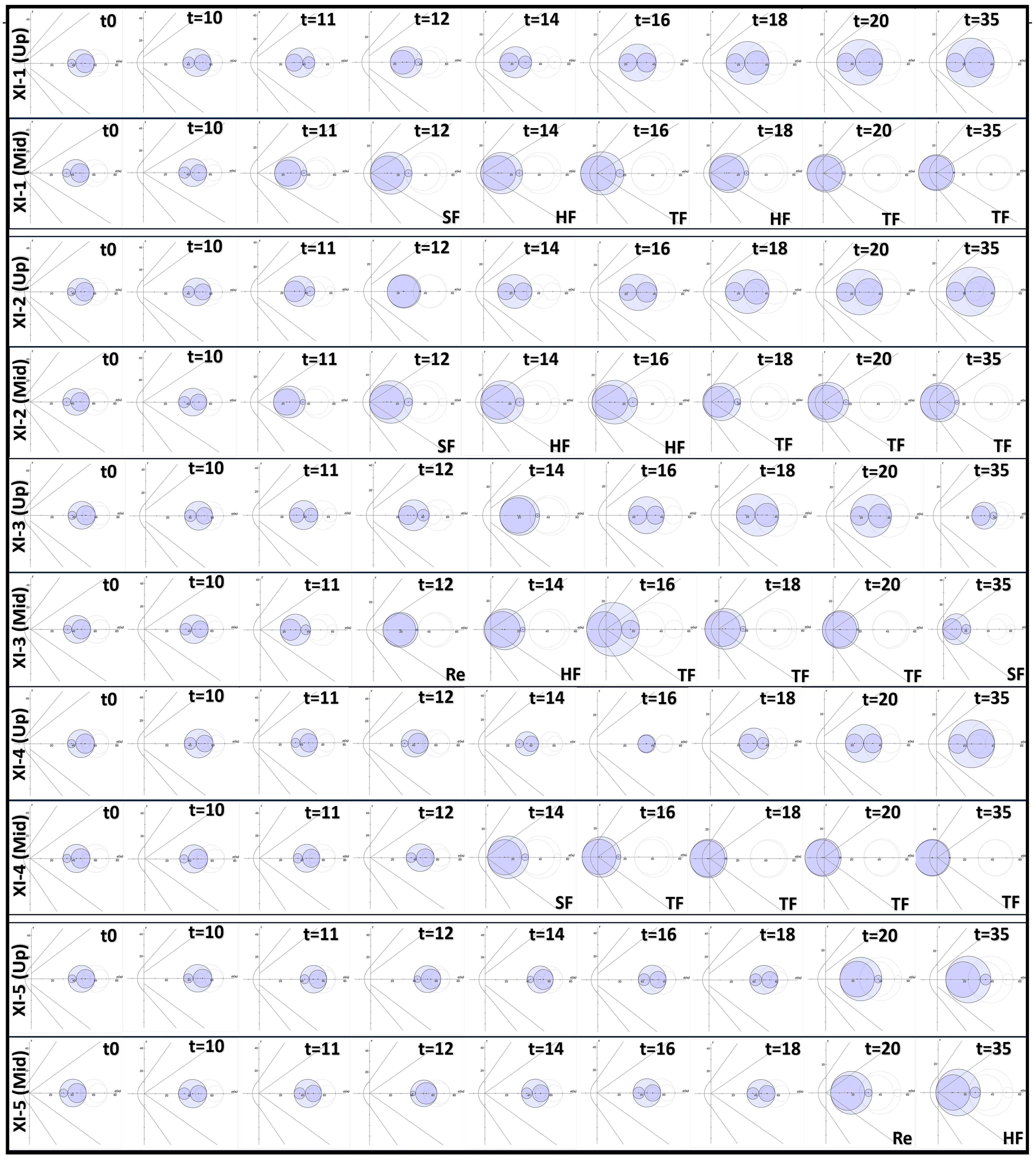 The main topic of this article is the evaluation of the geomechanical stability of the studied oil reservoir structure during IOR/EOR-supported oil production. In this context, questions regarding the influence of temperature and pressure on the resulting stress and strain state, as well as mapping the occurrence of rock failure, were raised. In addition to the geomechanical analysis, the elastic strain distributions were also investigated in order to determine the magnitude of changes in the transport properties of intact rock. In the model zones where the Mohr–Coulomb failure criterion was met, a corresponding flag was set for the reactivation or failure event. The author studied five non-isothermal cases (), as shown in Table 2, to verify reservoir stability and caprock tightness. For the most realistic case (), an additional detailed geomechanical analysis was performed, supplemented by Mohr circle diagrams for each stage of oil production supported by the EOR process.