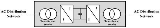 The structure of SOPs can be categorized into two types: back-to-back (BTB) and series/parallel configurations [14]. A BTB-type SOP typically consists of two AC–DC converters, through which two distribution systems are interconnected via AC–DC–AC power conversion [26]. Therefore, the design of a BTB-type SOP only needs to consider the voltage level and power requirements, without the need to account for phase angle differences [27]. As illustrated in Figure 1, a classical BTB-type SOP is typically connected between two nodes within the DN through AC–DC–AC converters. This configuration enables bidirectional active and reactive power exchange between nodes, thereby improving the system’s flexibility and voltage regulation capability.