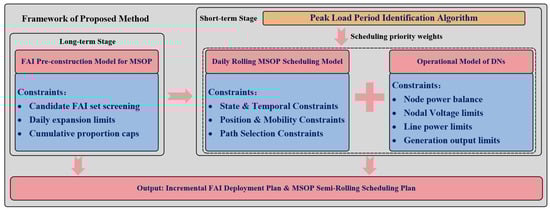 To address the spatio-temporal coupling complexity in the coordinated scheduling process of MSOP for DNs, this paper proposes a dual-layer coordinated approach that integrates the FAI pre-construction and the MSOP semi-rolling optimization model. This method aims to enhance the carrying capacity of charging stations during critical periods. The overall structure of the proposed method is illustrated in Figure 2.