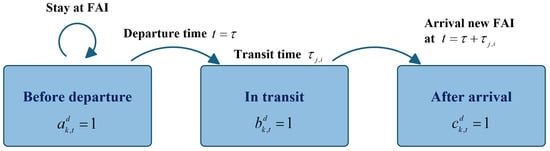 The MSOP’s status is modeled as a three-stage binary variable representing whether its status is before departure, in transit, or after arrival, respectively, as shown in Figure 3. The three stages are mutually exclusive as follows: