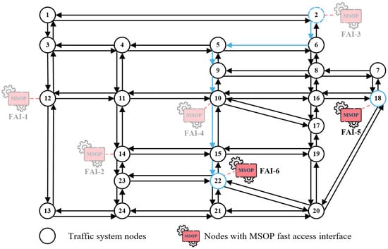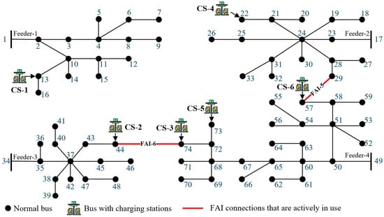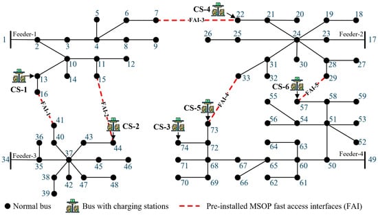 On the second day, based on the load curves and the cumulative forecasted energy demand during peak intervals for each charging station (see Table 4), it can be observed that the load variations at CS-1, -2, -4, and -6 are relatively minor, while CS-5 experiences a slight increase. In contrast, the overall charging demand at CS-3 rises significantly, leading to a sustained peak period that persists throughout the day. Under these conditions, the original MSOP deployment is no longer sufficient to maintain the high supply level required by Station 3. The optimal solution is to establish a new FAI-6 between distribution network node DN-44 and DN-74, and to reschedule the MSOP-1 originally located at RN-2 (connected to FAI-3) to RN-22 (corresponding to the newly constructed FAI-6) in order to support CS-3, as illustrated in Figure 7. It shows the FAI actively deployed on Day 2. Red solid lines represent the FAI connections that are in used, highlighting which interfaces are available for power flow.