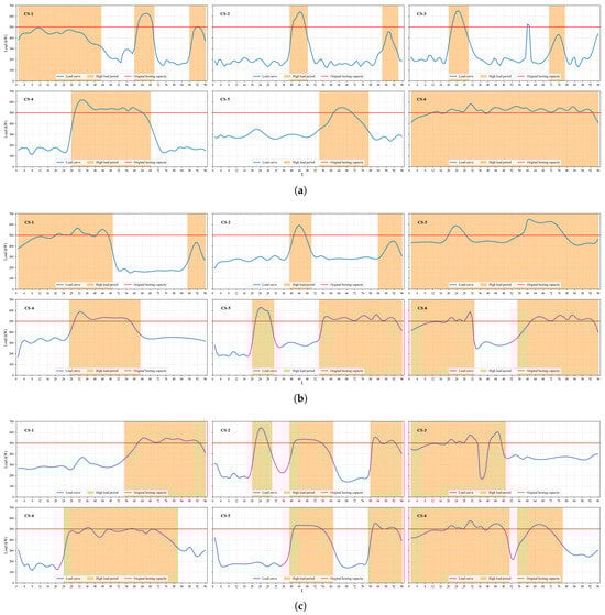Taking Charging Station 3 (CS-3) as an example, a short load peak occurs around on the first day; however, due to its short duration, it is not identified by the peak load period identification algorithm as a valid continuous peak period. Moreover, during t = 36–40 on the third day, a load valley is observed, but since it is closely surrounded by two adjacent peak periods, the algorithm still classifies this segment as part of the peak period, reflecting the comprehensive consideration of temporal continuity and dynamic load variations in the identification process.