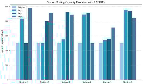 From a technical perspective, the proposed MSOP-based approach demonstrates significant effectiveness in enhancing system hosting capacity. The optimized total hosting capacity reaches 4588.1 kW, representing an absolute capacity gain of 1588.1 kW and a relative improvement of 52.9% compared to the baseline of 3000 kW. This substantial improvement is achieved through efficient resource utilization, with both MSOP units being actively dispatched daily (as shown in Figure 10) and different FAIs being dynamically activated based on daily operational needs.