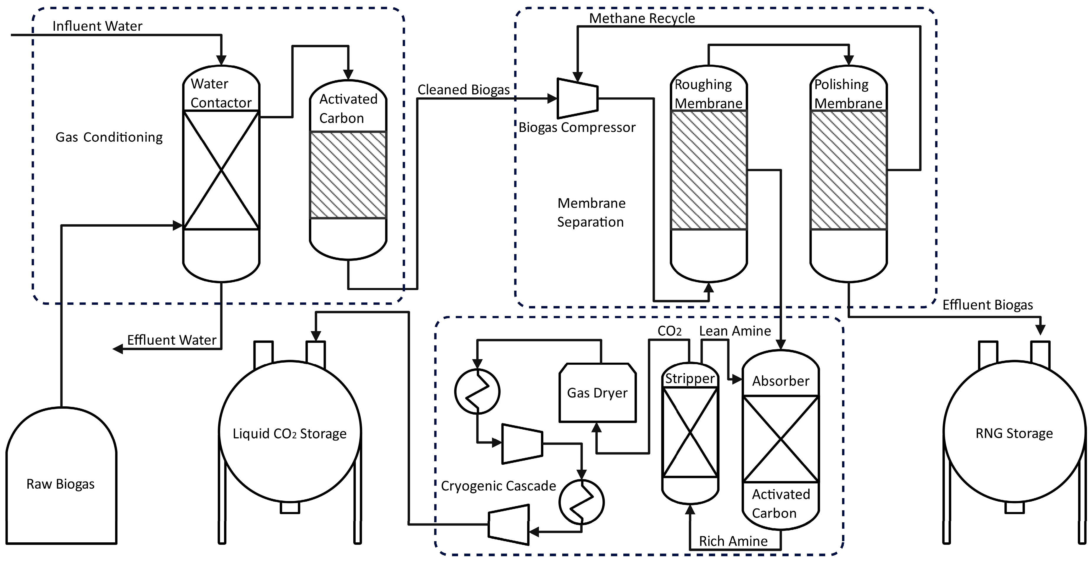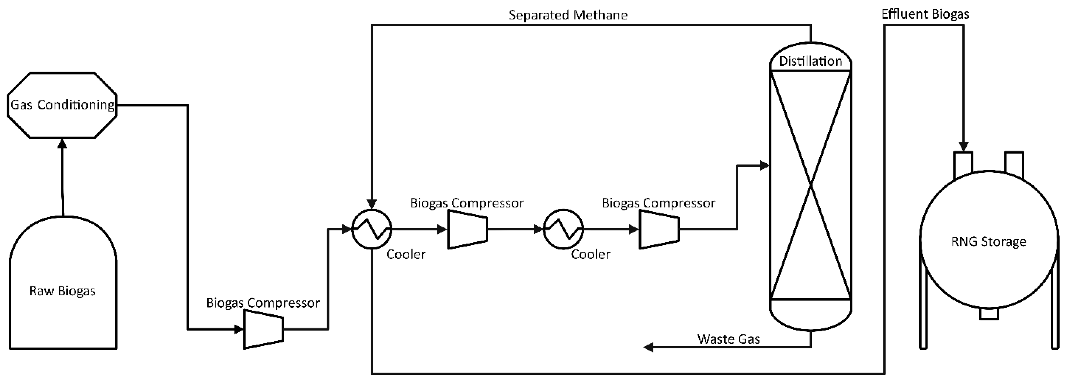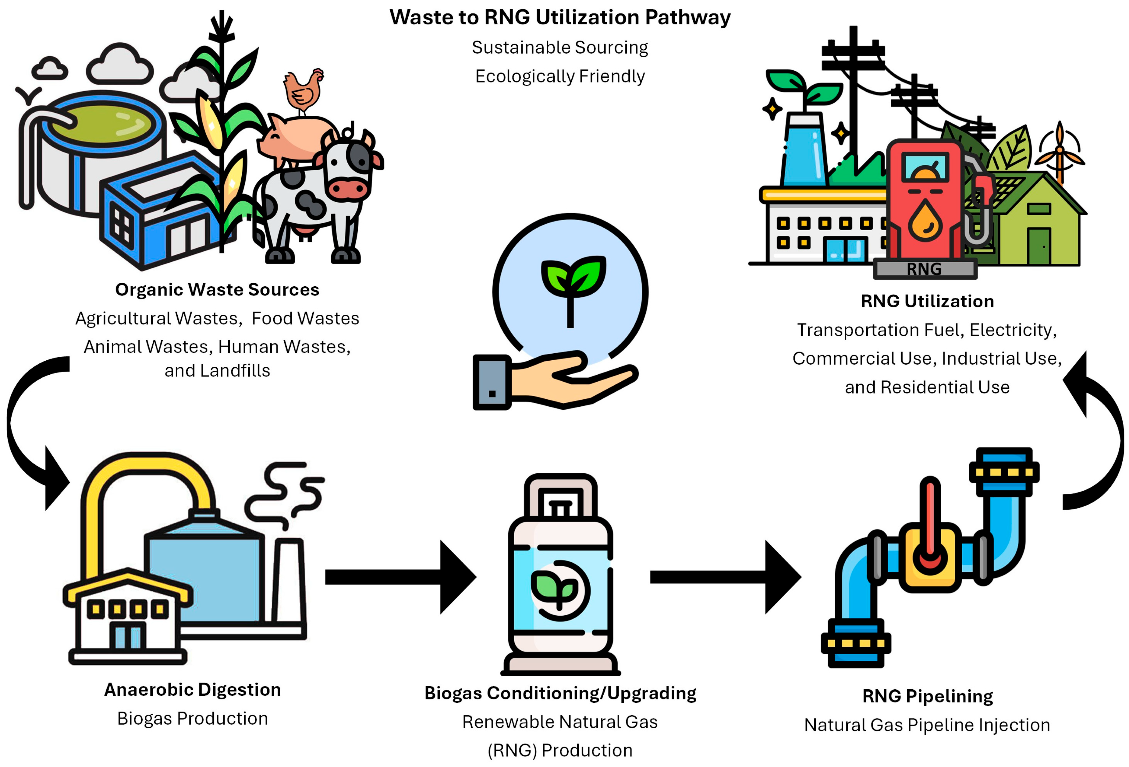 The production of renewable natural gas (RNG) begins with the utilization of organic waste materials, which can include agricultural waste, food waste, animal waste, landfilled materials, and wastewater sludge. These materials are rich in organic matter, making them ideal feedstocks for the production of biogas, a product of anaerobic digestion. Anaerobic digestion is a biological process that occurs in the absence of oxygen, where microorganisms break down this matter to produce biogas. Compositionally, biogas is a mixture of methane (CH4), carbon dioxide (CO2), and other trace contaminants [1,2]. Biogas may be produced from engineered anaerobic digesters and/or landfills with technically any system (swamps, storage bins, etc.) that supports anaerobic bio-decomposition of organic wastes into biogas. However, anaerobic digesters and landfills are by far the most common source of biogas capable of being captured and converted into RNG and/or other products.