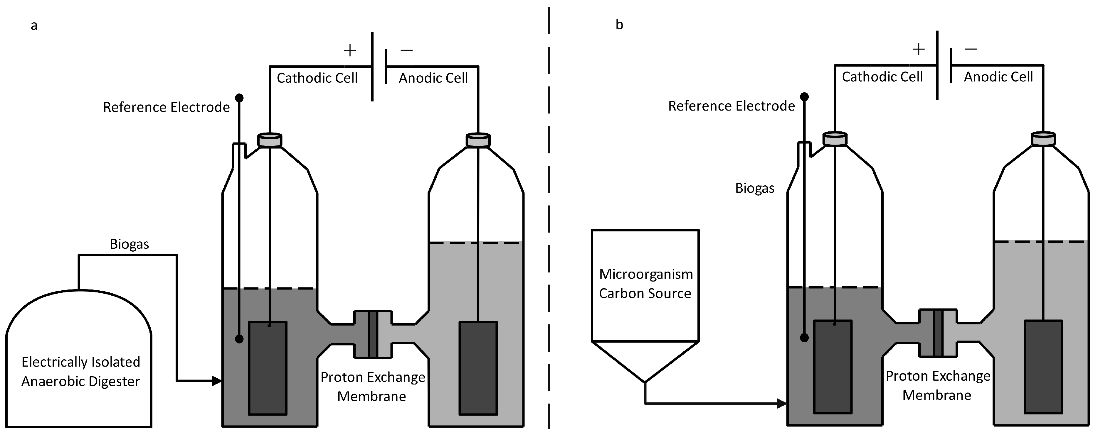 Figure 6. Bio-electrochemical System for CH4 Production and Upgrading. (a) Digestion isolated from Cathode. (b) Digestion integrated in Cathodic Cell.