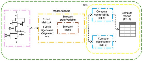 To overcome this limitation, ref. [] proposed a methodology for constructing the matrices  and  within the DPL environment. By reconstructing these matrices, it becomes possible to compute residues directly from the available modal information, enabling the evaluation of system controllability from relevant inputs such as generators equipped with PSS devices.
