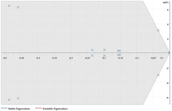 These results emphasize the necessity of introducing damping controllers, specifically PSSs, in order to improve the system’s small-signal stability. The placement and tuning of such devices can be effectively guided by the residue-based methodology presented in this paper. As described in Section 2, residues provide a direct measure of modal controllability and observability by combining the left and right eigenvectors with the input and output matrices  and . The codes implemented in DPL (Algorithms 1–4) automate this process, enabling the identification of the generators with the highest residues for each oscillatory mode. This contribution bridges the gap between modal theory and practical implementation in PowerFactory, offering a systematic framework for controller allocation and tuning in realistic system studies.