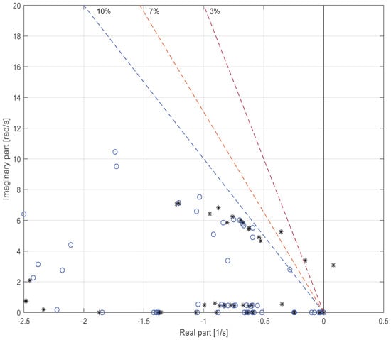 When the proposed residue-based tuning methodology is applied, PSS parameters are adjusted at the most influential generators, as determined by their residue values. This process ensures that controller effort is concentrated where it yields the maximum damping improvement. The effect of this tuning is illustrated in Figure 8, which shows the displacement of oscillatory modes in the complex plane. Open-loop eigenvalues are depicted as blue circles, while the closed-loop eigenvalues—after the installation and tuning of PSSs at the identified generators—are represented by black markers. The dashed lines correspond to constant damping-ratio loci (3%, 7%, and 10%), serving as reference boundaries for evaluating system performance, as shown in Table 5.