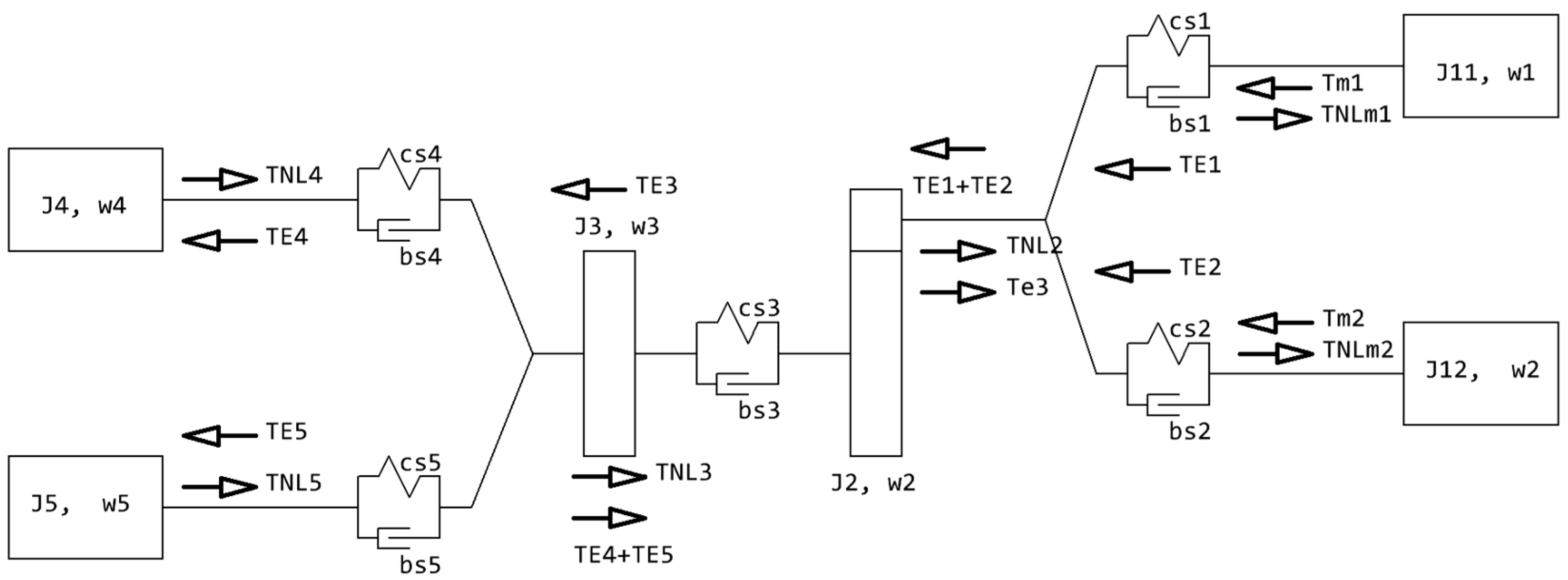 J11, J12 are the rotational masses that take into account the moments of inertia of the drive electric motors D1 and D2 and the distributed moments of inertia of the corresponding shafts S1 and S2, which can be calculated according to the following formulas: