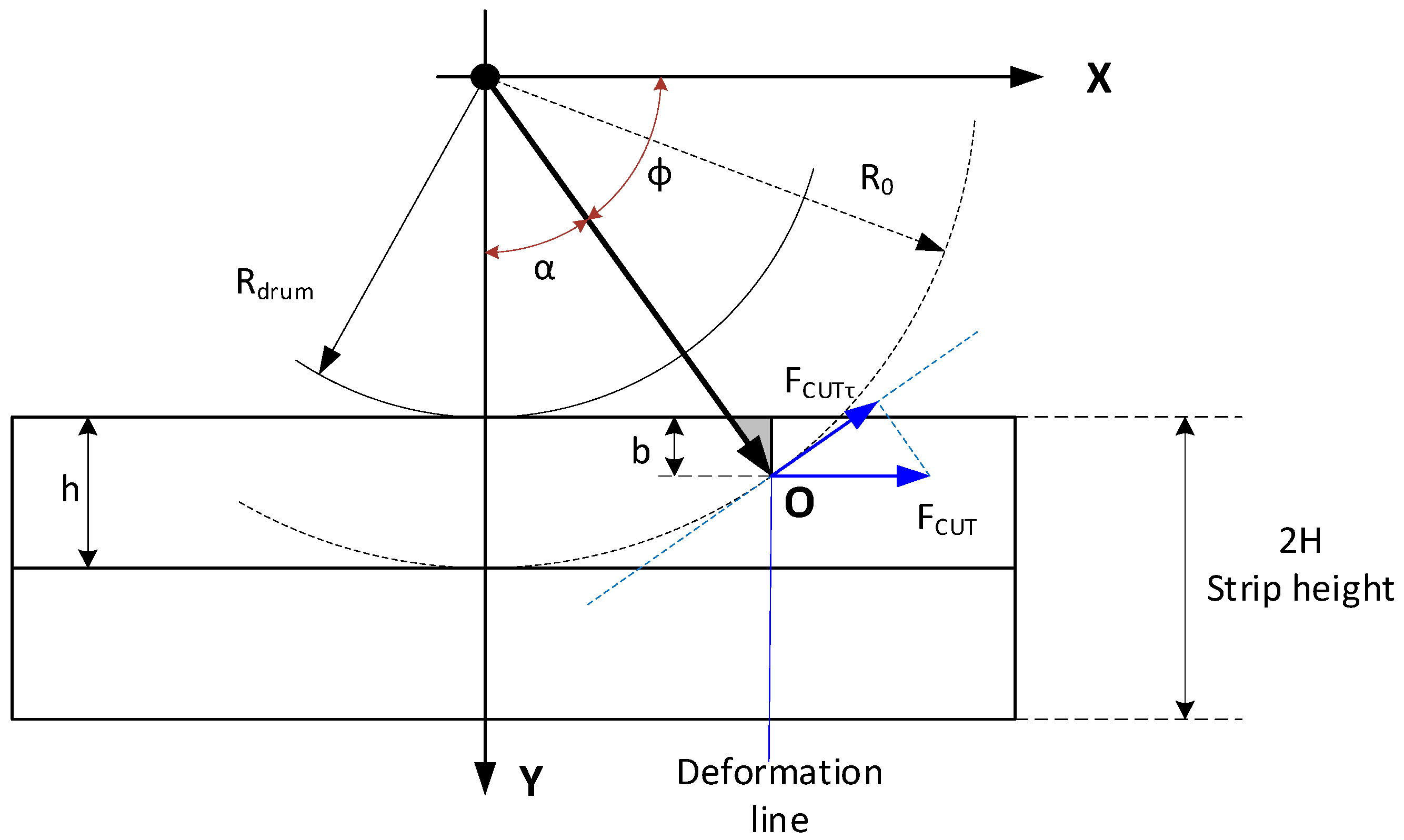 2], a complex analysis of the process of cutting 40 Mn strip steel on flying shears using finite element methods was presented. The authors performed a kinematic study of the flying shears mechanism and created a plane strain FEM-model using the Johnson–Cook constitutive model.
