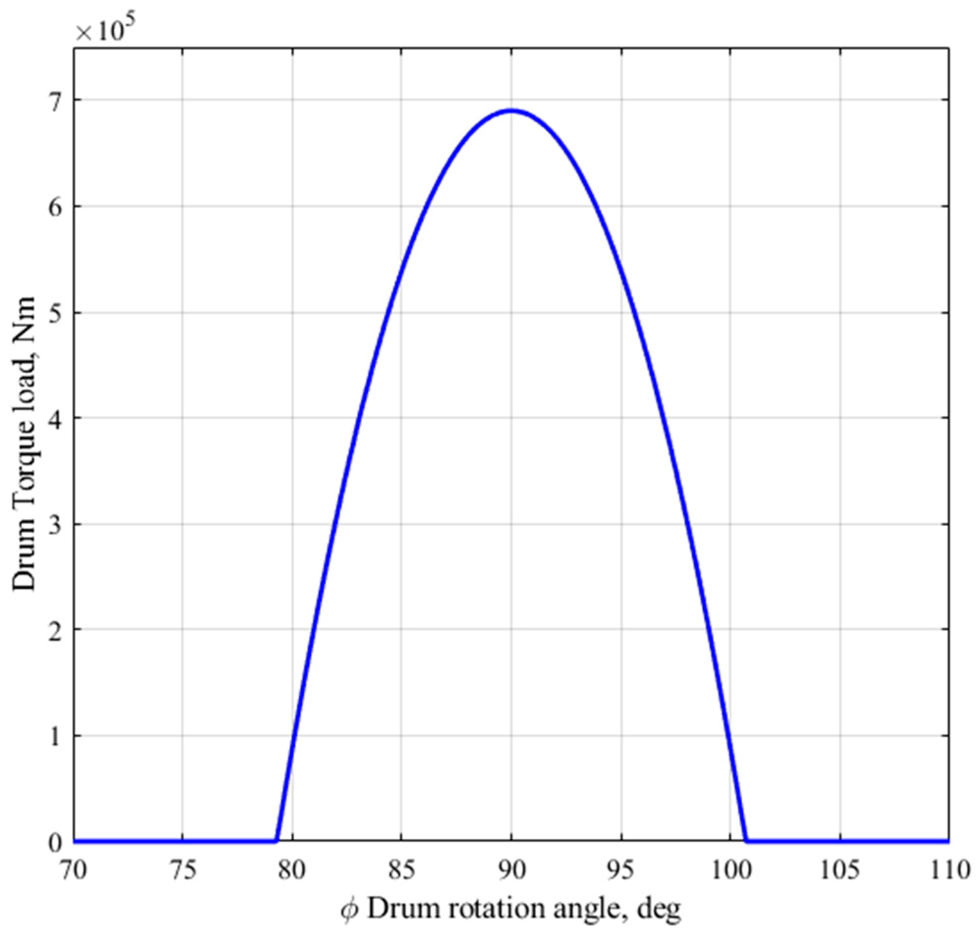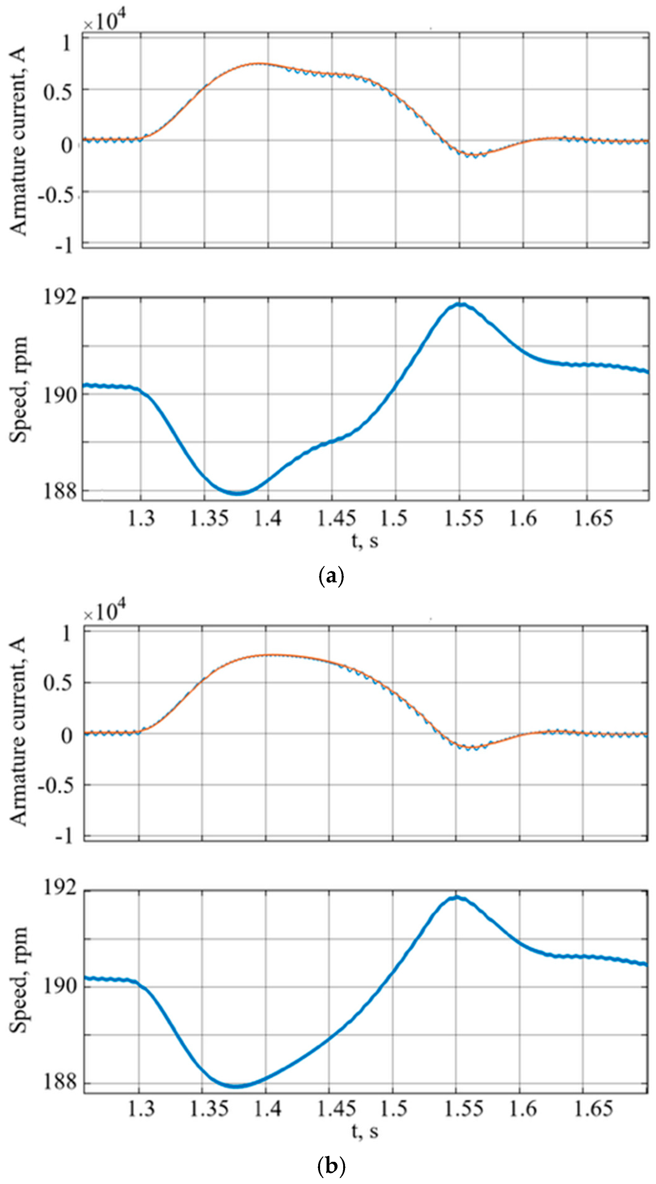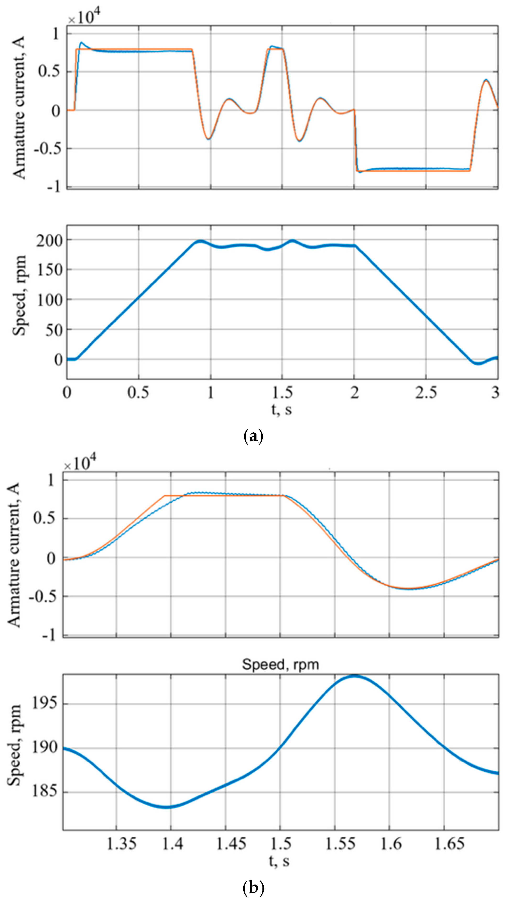 The range of angular velocity oscillations decreased almost four times: Δω2 = 4 rpm compared with Δω1 = 17 rpm in a system with classic controllers. During the cutting process, the speed controller does not enter the saturation mode, which provides the damping of oscillations in the mechanical part of the drum shears and the end of the transient process within 0.1 s after the end of the cutting process. Even when the cutting force was increased by 10%, only the shape of the current graph changed without changing the overall duration of the transient process and the amplitude of the speed oscillation.