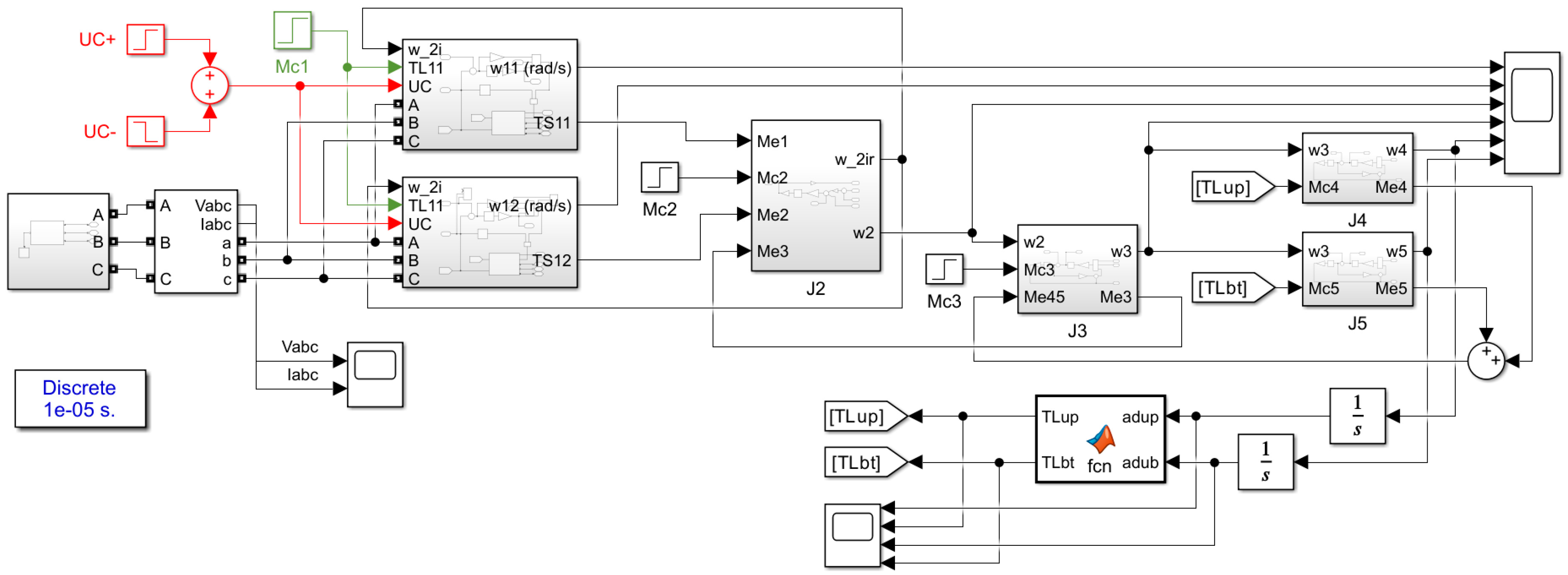 As a basic model of a direct current electric drive with a multi-circuit system of subordinate control, a block of a 4-quadrant three-phase reversible electric drive from the MATLAB 2024a, Simscape\Electrical library was used (