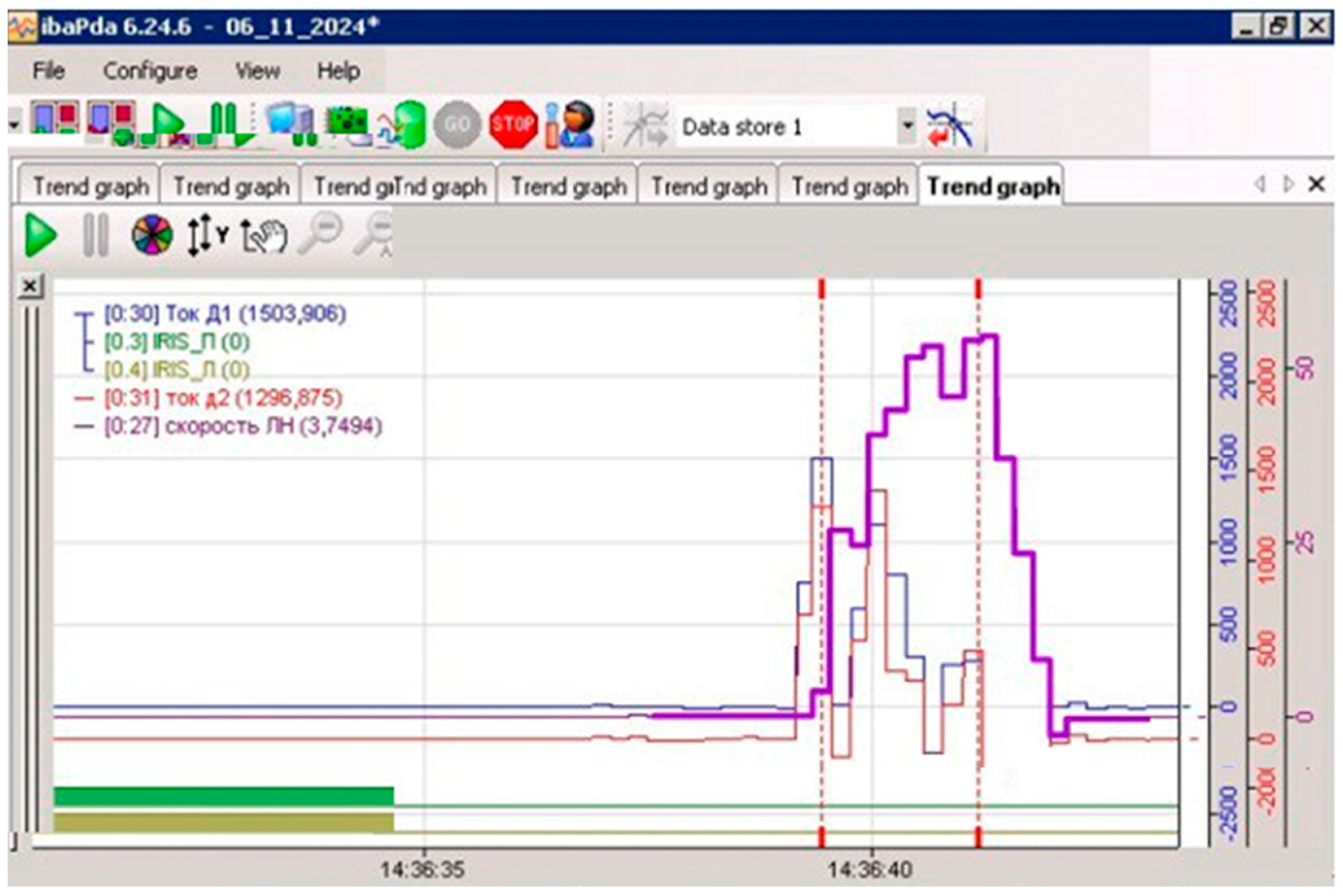 Speed and current controllers with built-in neural networks made it possible to limit speed fluctuations during cutting in the range from 188 to 192 rpm. Other static and dynamic indicators are shown in