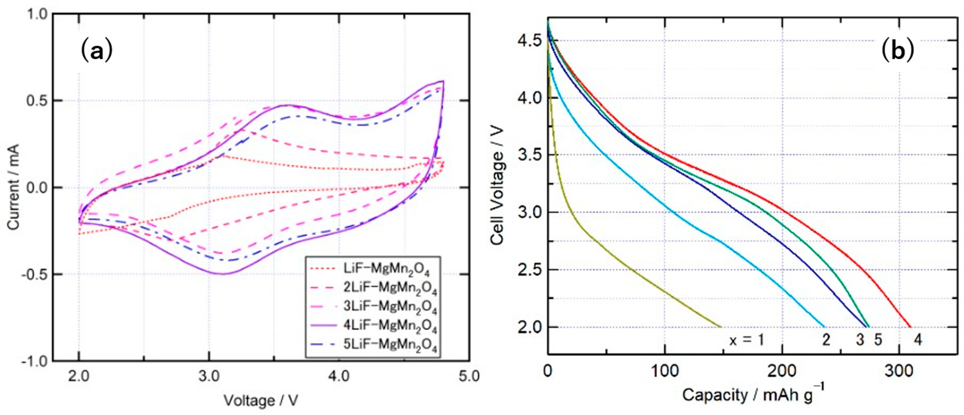 - Tomita, Y.; Kimura, N.; Nasu, H.; Kohno, Y. Fabrication and charge–discharge properties of composites of LiF and NixMn1−xO solid solution for cathode material of Li-ion secondary battery. J. Appl. Electrochem. 2020, 50, 917–923. [Google Scholar] [CrossRef]