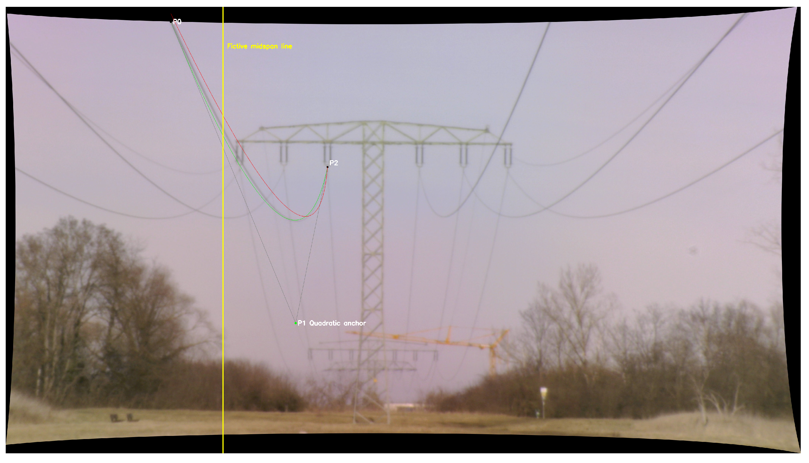 For template generation in our sag detection application, the endpoint anchor points and are fixed at the transmission tower locations, representing the cable attachment points. The intermediate handle point serves as the variable parameter that controls the curve shape and sag magnitude. By systematically varying the position of while keeping and constant, we generate a library of Bézier curve templates representing different sag conditions for the template matching process.