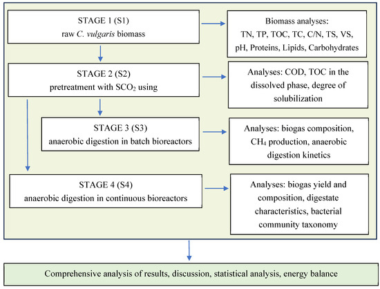 This study was conducted in four sequential stages (S). In Stage 1 (S1), a physicochemical characterisation of the organic substrate, namely Chlorella vulgaris microalgae, was performed. In Stage 2 (S2), the C. vulgaris biomass was subjected to low-temperature pretreatment with SCO2, followed by analyses of organic compounds (COD, TOC) to allow indirect assessment of process efficiency.